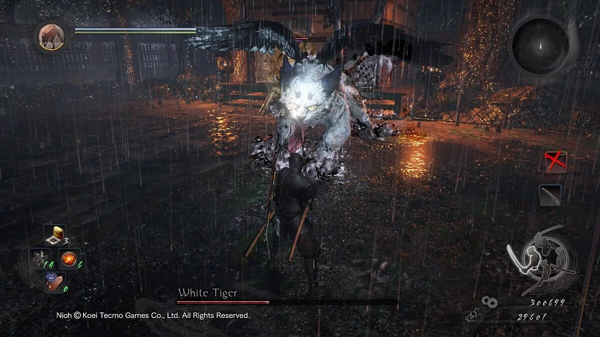 Что-то в этом Белом Тигре напоминает о некоторых боссах Dark Souls и, конечно, о Химере из Dragon's Dogma. Это крупное четвероногое существо вынуждает игрока защищаться, но при этом не дает разорвать дистанцию. От Тигра нельзя убежать, с ним можно только кружиться в танце смерти.