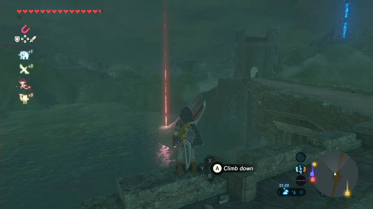 Как видно на карте, святилище Гома Асаах является ближайшим телепортом. Однако после перемещения на гору, вам еще придется потратить время на скалолазание. Добравшись до вершины горы, посмотрите на главный замок Хайрула на юго-востоке.