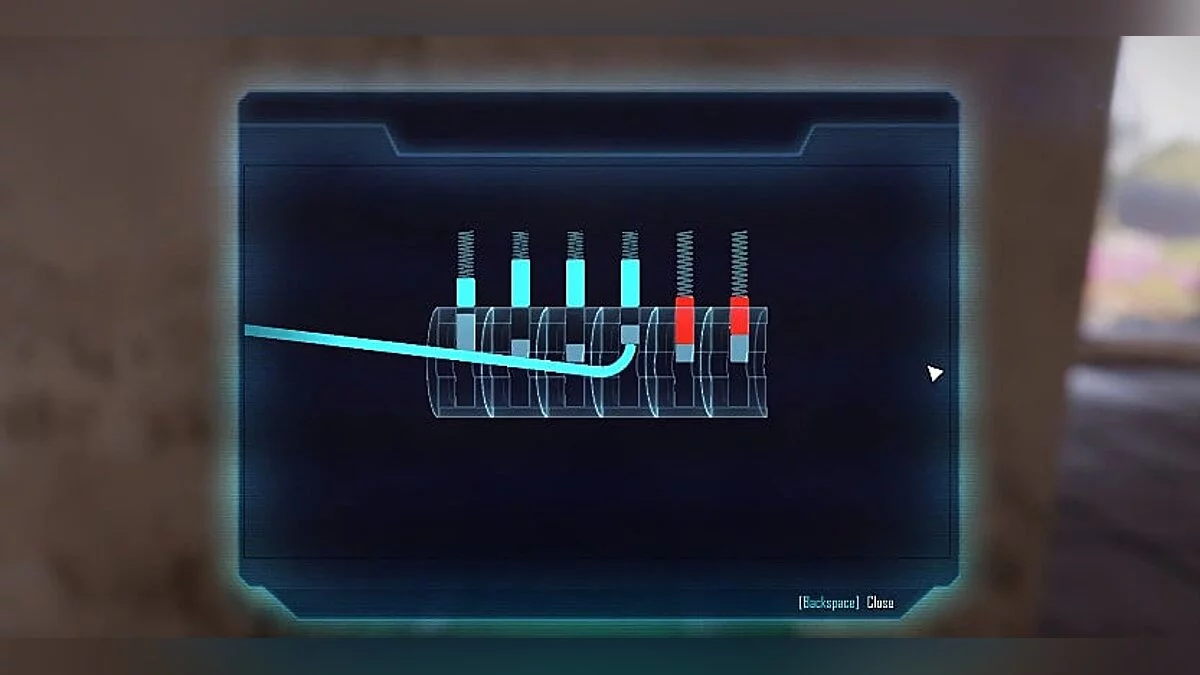 Упрощая можно сказать, что вам нужно найти парные болты. На примере следующей картинки, где верная последовательность 3-2-4-1-5-6. То есть, будет пара 3-2,4-1,5-6, а если вы выбьетесь из последовательности, то результат сбросится. Если же наберёте все верно, то замок откроется.