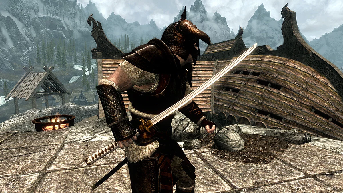 Катану можно найти в Храме Небесной гавани по ходу выполнения квеста «Стена Алдуина» (Alduin's Wall). Задание сюжетное, так что пропустить его будет трудно. Бич драконов лежит в комнате, которая находится чуть поодаль от главного зала Храма. Там же можно найти броню Клинков.