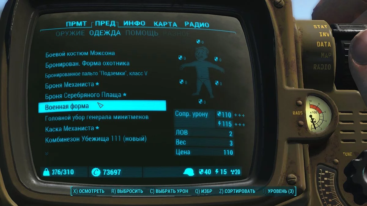 - армейская форма чуть хуже — 110 на 110, а характеристики +1 к силе, +1 к ловкости. Встречается на довоенных объектах армии США, Её можно найти на трупах офицеров и солдат, охранявших проходную Убежища 111: