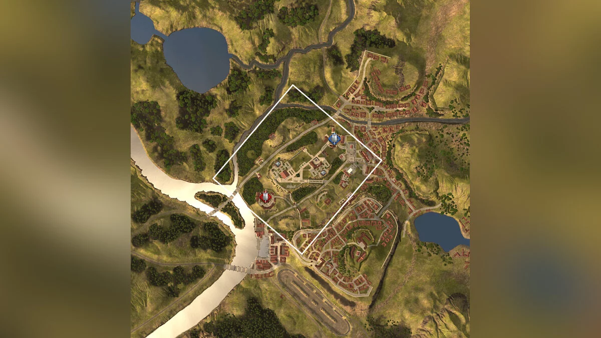 Перед вами большая, симметричная, квадратная карта, лагери команд расположены по диагонали, а линия симметрии проходит через другую пару углов. Первая карта с городом, через который проходят боевые действия, она также находится в основе для новых игроков.