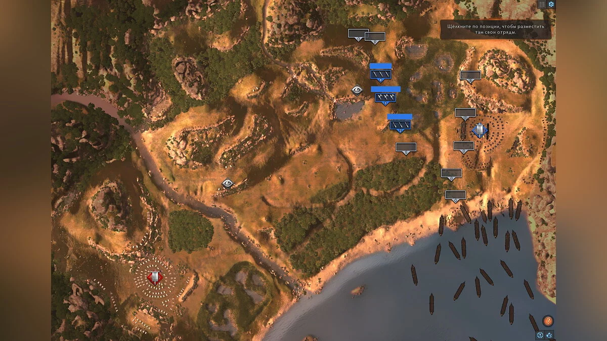 Для доминирования на карте вашей команде необходимо иметь: 3 отряда артиллерии (не скорпионы), 6 отрядов пикинеров для купирования флангов, 6 отрядов лучников для действий по центру, 6 отрядов конницы для обхода через побережье или холмы. Конкретную позицию выбирайте исходя из собственного или командного плана на игру, но пикинерам желательно блокировать низ и верх карты.