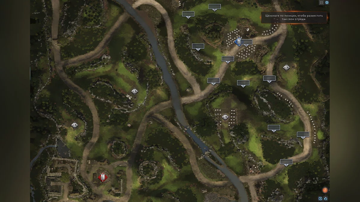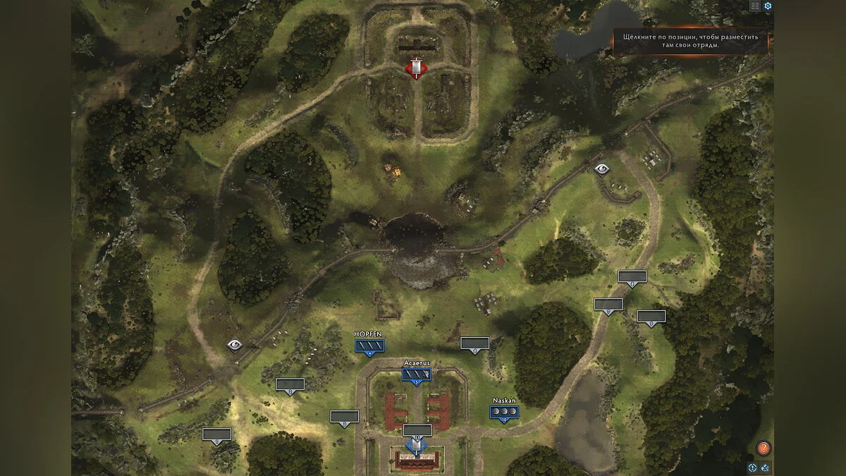 Обязательно нужно контролировать стратегическую точку (вышку), чтобы видеть все поле боя, а также выход из леса и проходы с холмов.