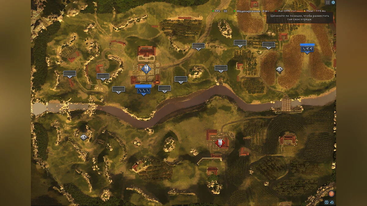 Большое влияние на геймплей оказывает широкая река, протекающая через всю карту. Она сильно снижает подвижность и защищенность солдат, пока они в ней находятся. Там же они будут получать повышенный урон. Крутой берег проходим вброд далеко не во всех местах, а на выходе из воды солдат поджидают пехотные колья, выжженная земля и прочие радости, не говоря уже о вражеских отрядах.