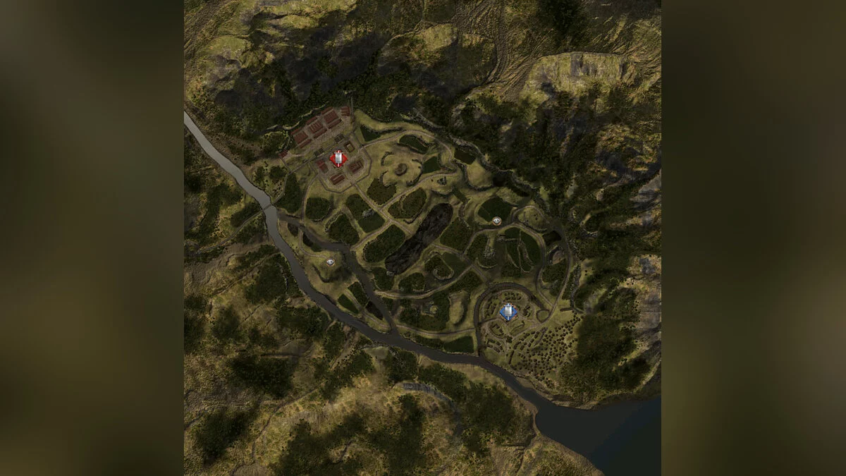 Местность на карте сложная. Между двух гор течет большая река, пересечение которой вброд возможно на трех широких участках: по центру и по флангам. Это самая низкая точка, от неё вверх в обе стороны идет крутой подъем по склону к базам команд, которые находятся на самой высокой точке.