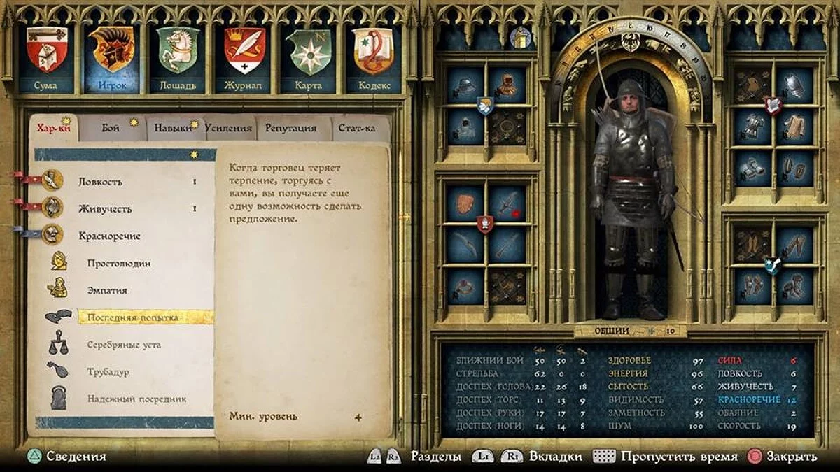 Торговля — целое искусство в Kingdom Come: Deliverance. Чтобы преуспеть в нем, стоит получить перк «Последнее предложение». Перейдите в раздел «Игрок» в меню. Перейдите в раздел «Статистика» и найдите параметр «Красноречие». Для получения перка «Последнее предложение» нужно иметь уровень красноречия выше 4.