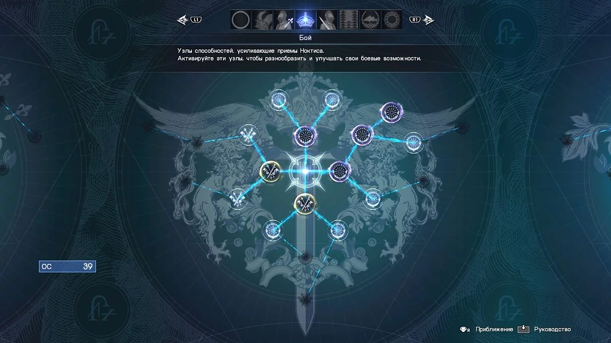 Меню состоит из разных категорий. На каждой странице расположены способности, разбитые по тематикам. Некоторые из них сделают Ноктиса сильнее, некоторые улучшат взаимодействие с напарниками.