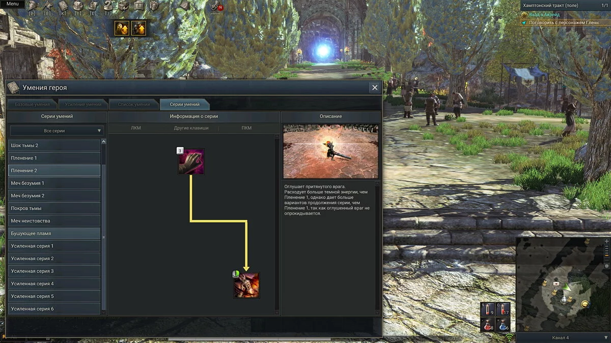 - Пленение — оглушает, подавляет, опрокидывает врагов, серия ударов уменьшает защиту от огня и магии тьмы.