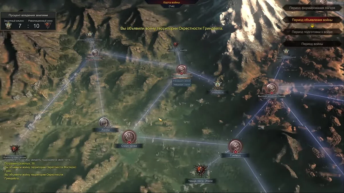 Сражения происходят в несколько этапов, сначала на глобальной карте выбирается цель, затем загружается не очень большая карта. Тут все просто — надо разрушить вражеские врата или защитить свои, на карте присутствуют мобы, толкающиеся друг с другом в центре, а также полководцы с отрядами, которые должны поддерживать своих союзников в центре и держать фланги.