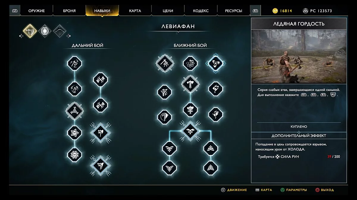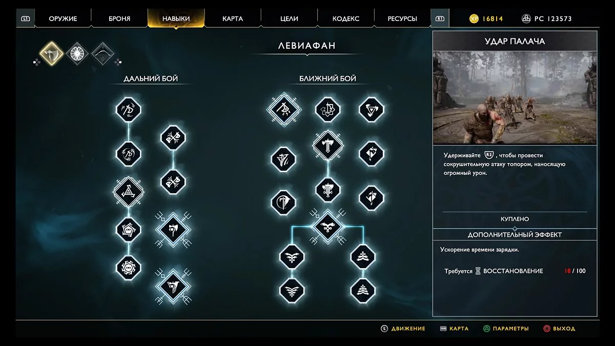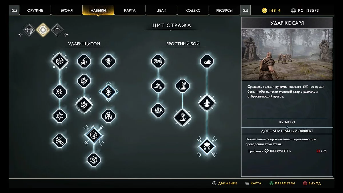 «Удар косаря» — это потрясающий навык, который пригодиться вам для ближнего боя. Он позволяет мгновенно сократить дистанцию между Кратосом и врагом, нанеся удар во время бега. Навык позволяет оглушить небольших монстров.