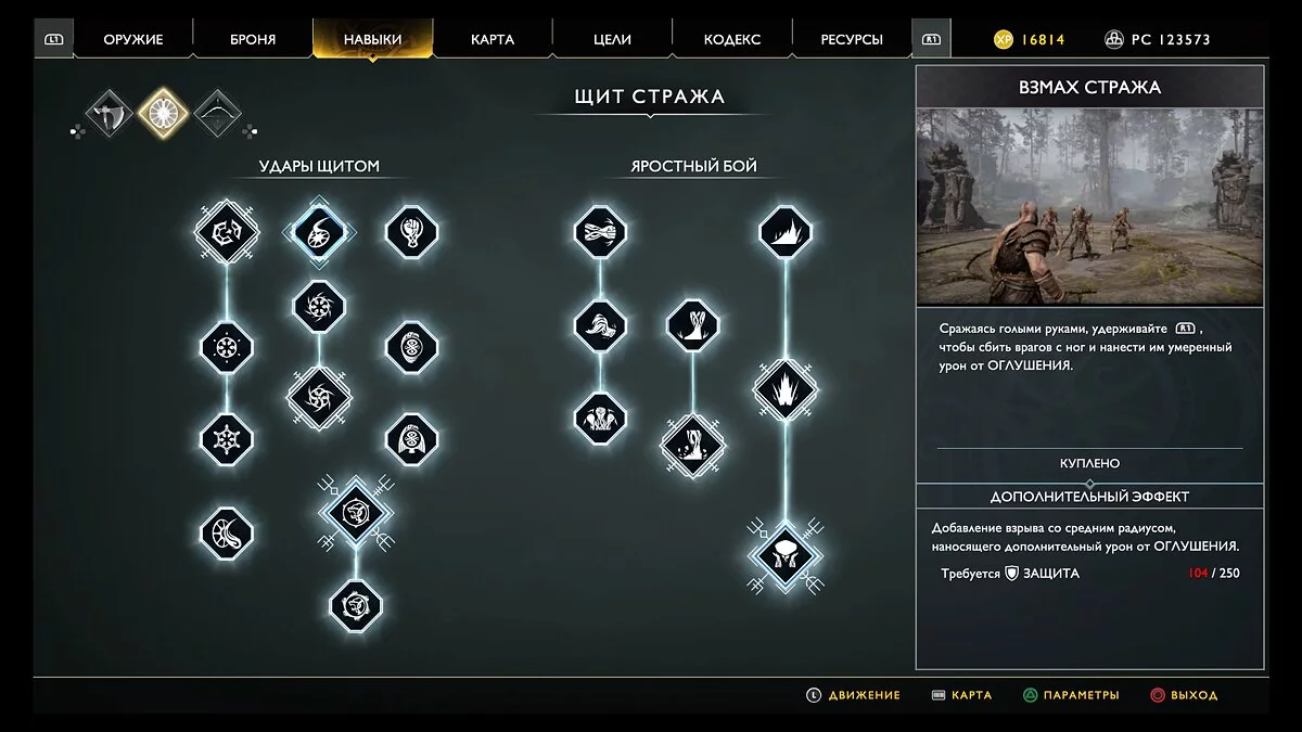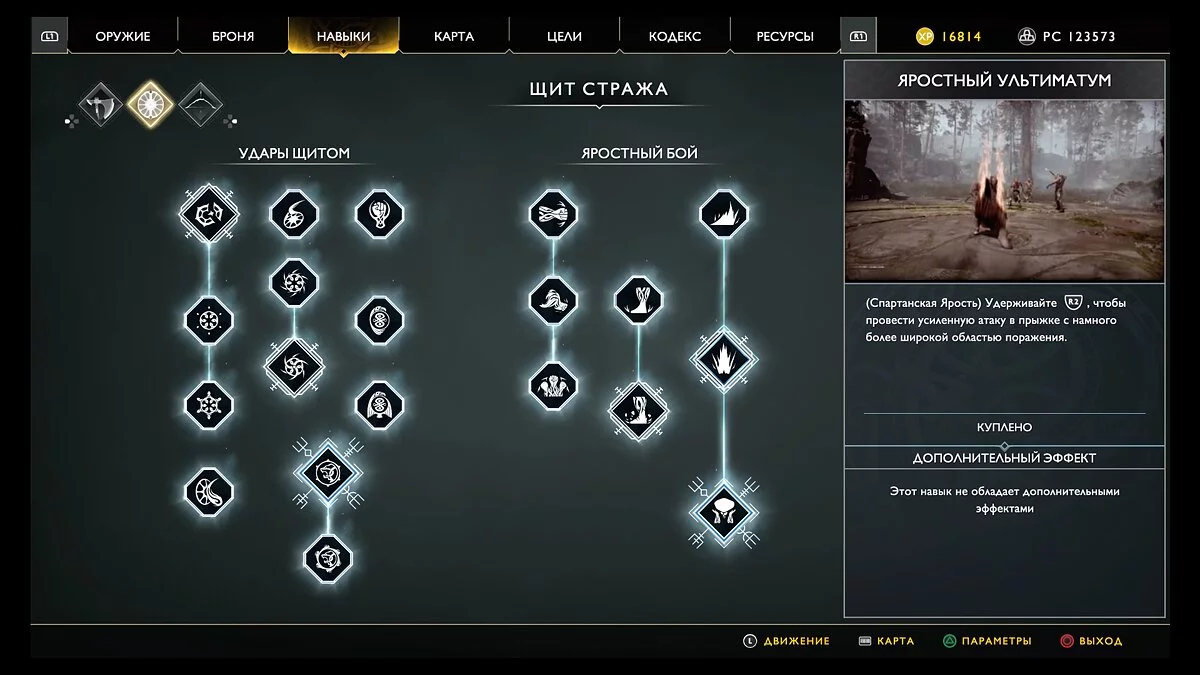 «Правосудие стража» — отличный способ нанести огромный оглушающий урон по врагам. Не самый расторопный навык Кратоса, но когда вы разблокируете его следующий уровень, он станет лучшим завершением комбинации с использованием щита. Также с помощью этой атаки можно сбрасывать противников с утесов.