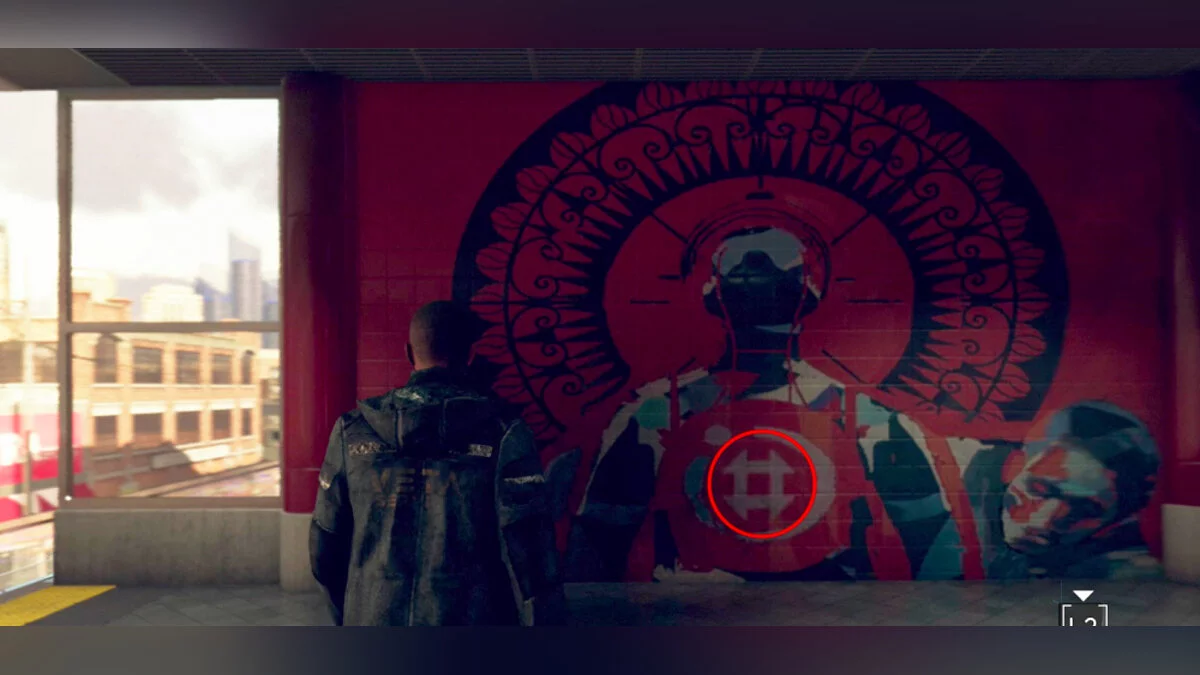 Первое изображение попадется вам на глаза, как только вы выйдете из поезда. Поверните налево и увидите его на груди изображенного человека. Второй символ будет найден после того, как вы спуститесь вниз на эскалаторе. В нижнем левом и верхнем правом углу граффити.