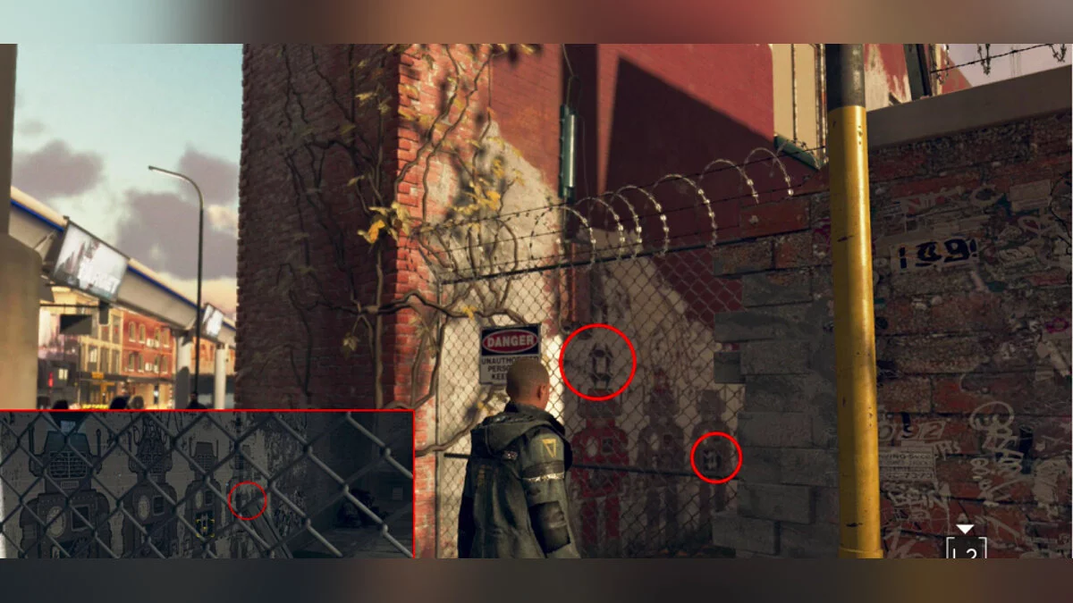 После этого, вам нужно попасть во внутренний двор. Обратите внимание на граффити, что находится наверху, на стене. Первый символ вы найдете вверху рисунка, второй между словами в надписи и третий в нижней части.