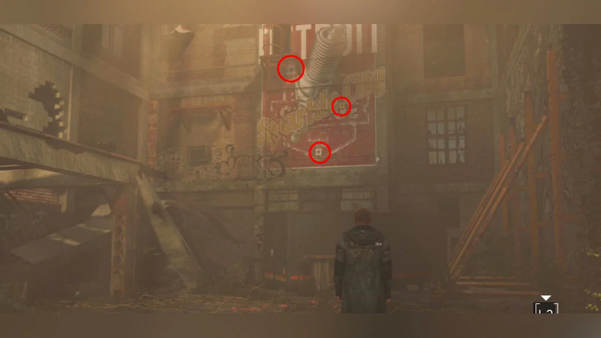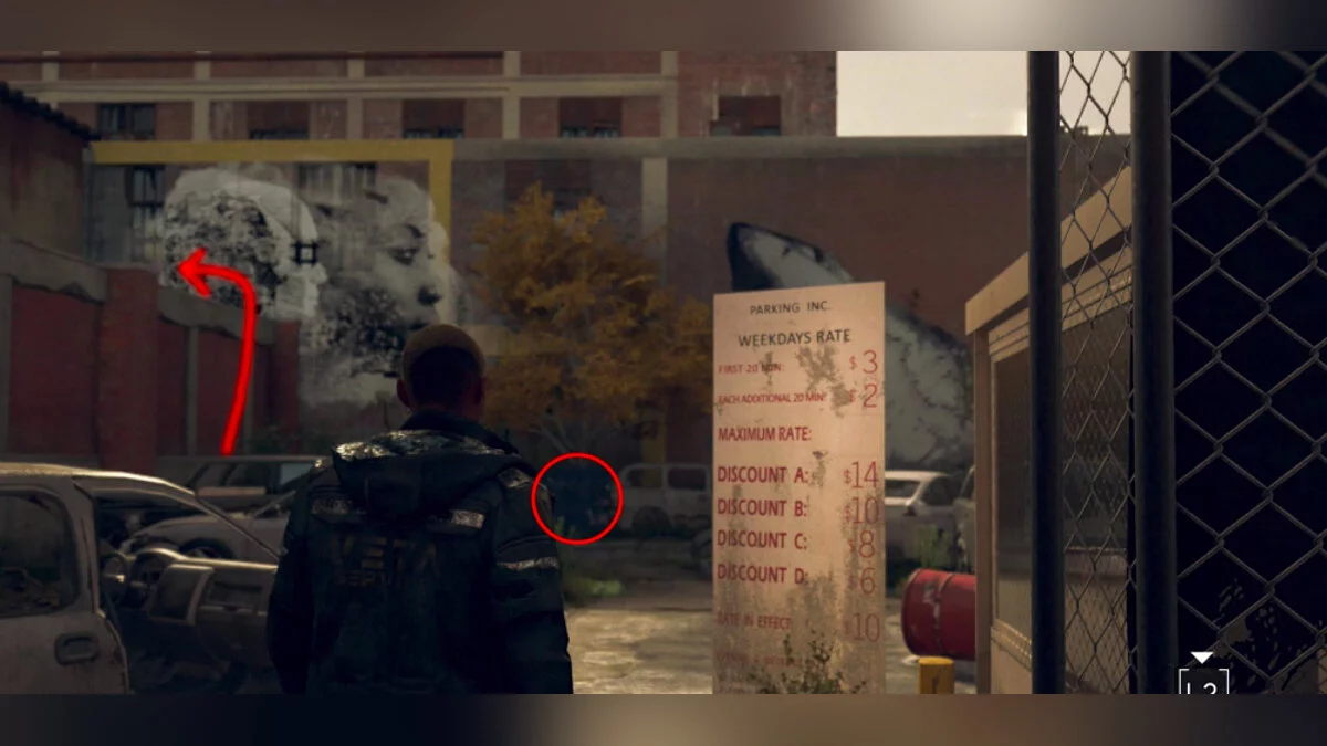 Осмотрите стену над стоянкой, чтобы найти следующее граффити. Затем заберитесь на крышу с помощью синего контейнера. На изображении двух голов вы найдете еще три символа.