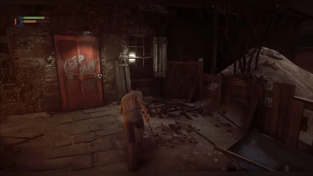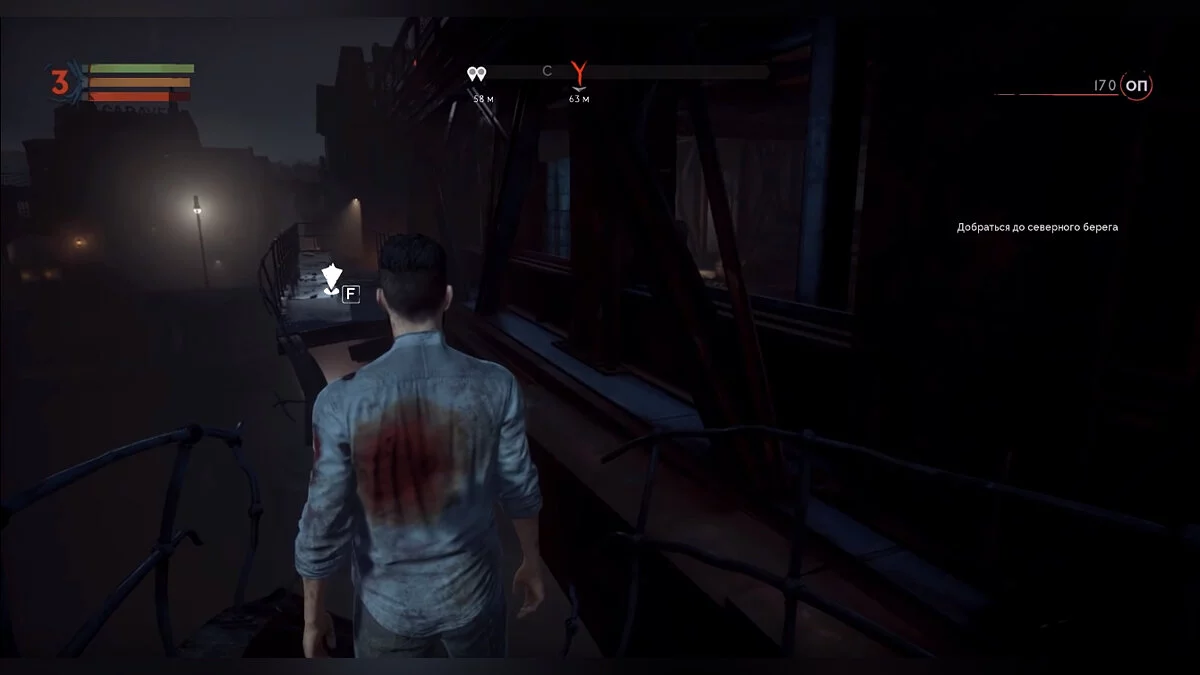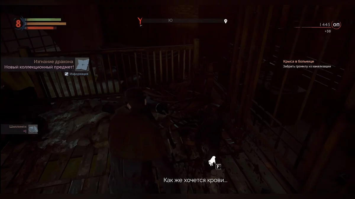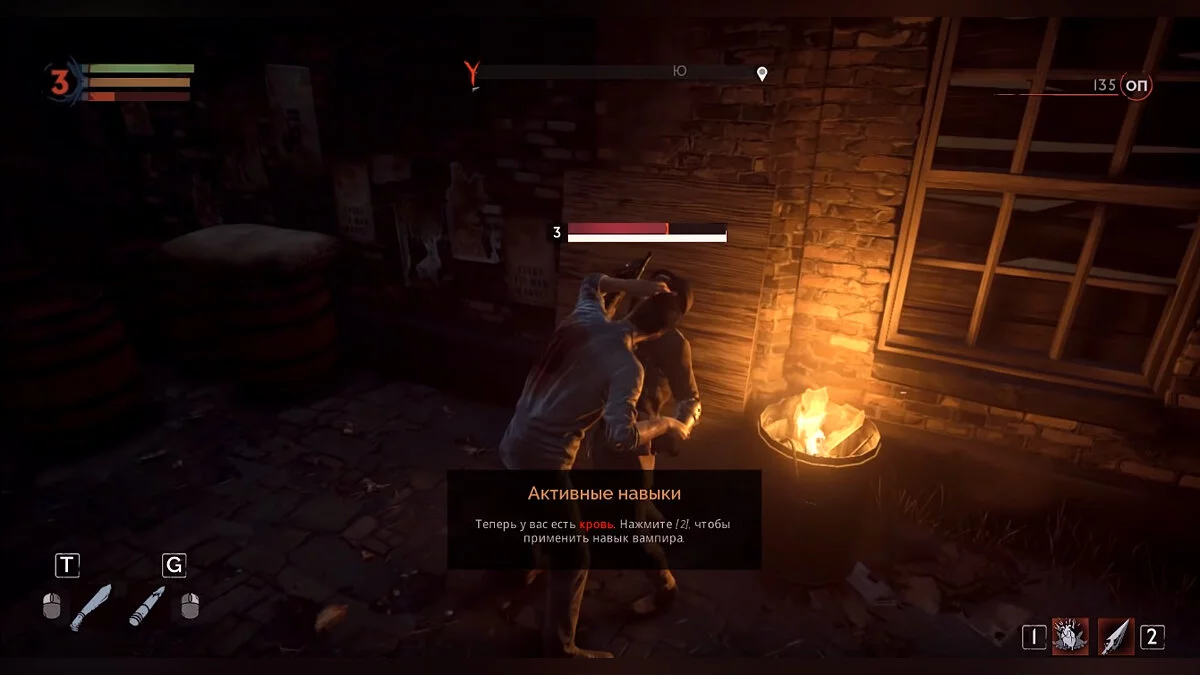 Джонатан научился делать «телепорты», таким образом забираемся на второй этаж и заходим в дверь. Спускаемся вниз, с тела берем Ключ от убежища и оружие для левой руки — Старый кол. Открываем дверь и выходим на улицу. Справа за углом будет враг, которого нам нужно оглушить и укусить. Укусив врага, герой получает кровь, нужную для применения навыков.