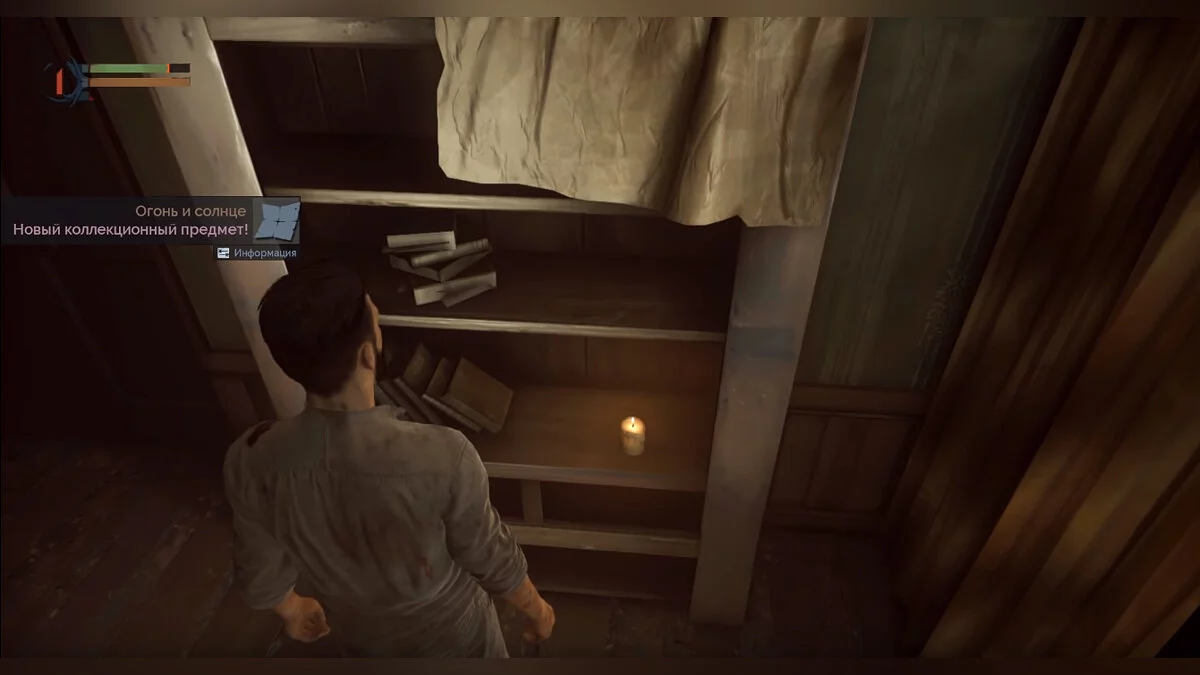 Джонатан заблокирует дверь. На столе можно посмотреть фотографию. В комоде слева взять деньги, а в шкафу напротив найти первый коллекционный предмет — записку «Огонь и солнце».