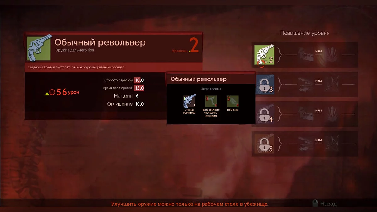В комнате справа на полу лежит труп, возле которого герой найдет свои часы. Поднимаемся на второй этаж. Смотримся в зеркало, чтобы запустить кат-сцену. В комоде рядом берем шиллинги. В соседней комнате будет еще труп. Джонатан возьмет пистолет (Старый револьвер). Оружие в игре можно улучшать на рабочем столе в убежище.