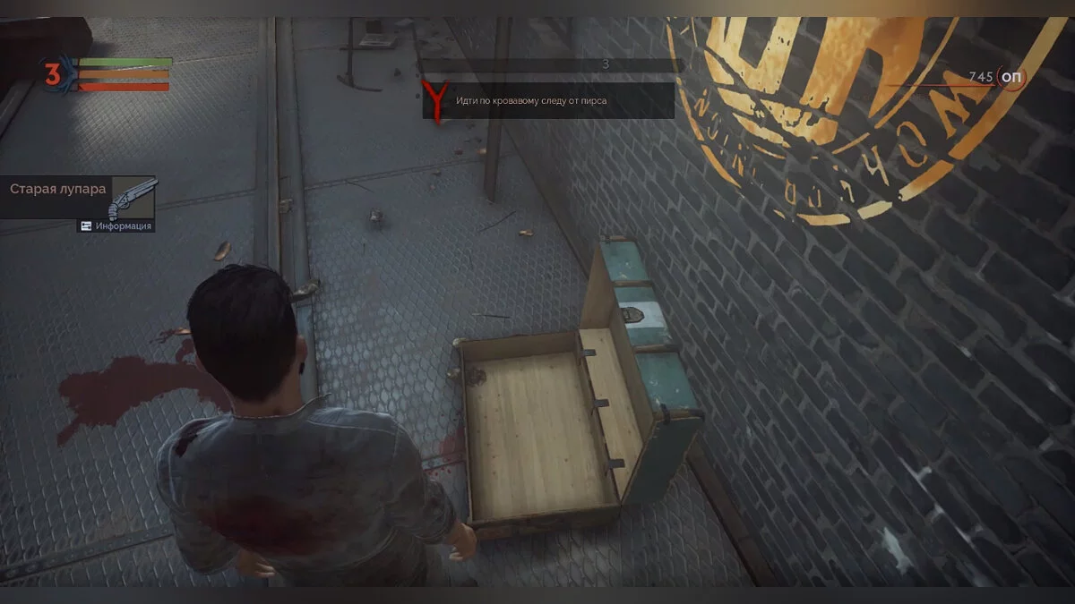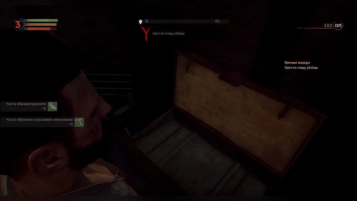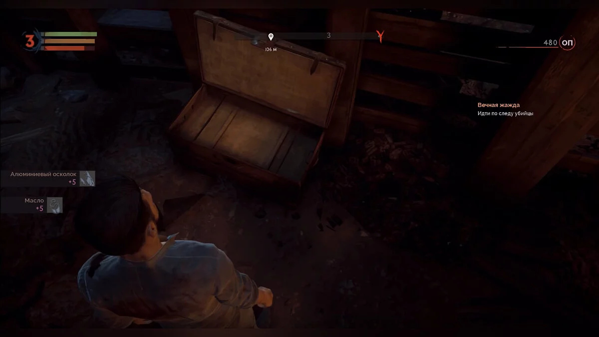 Идем дальше и подбираем шиллинги на бочке около лестницы вниз. Внизу на бочке будут еще деньги. Выходим и впереди находим следы крови и тело. Сперва идем влево, тут в сундуке берем алюминиевые осколки и масло (ресурсы, нужные для улучшения оружия). Используем вампирское чутье и поднимаемся на уступ. Справ от сундука ломаем коробки и заходим в туннель, тут берем деньги и находим запертый сундук.