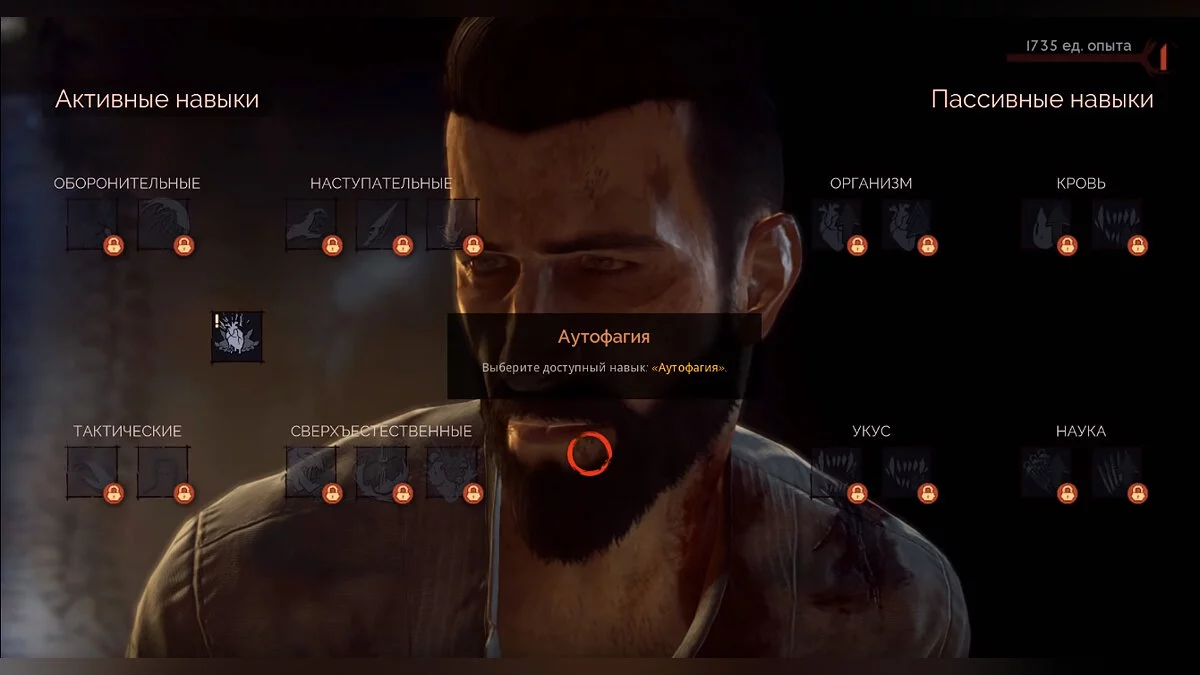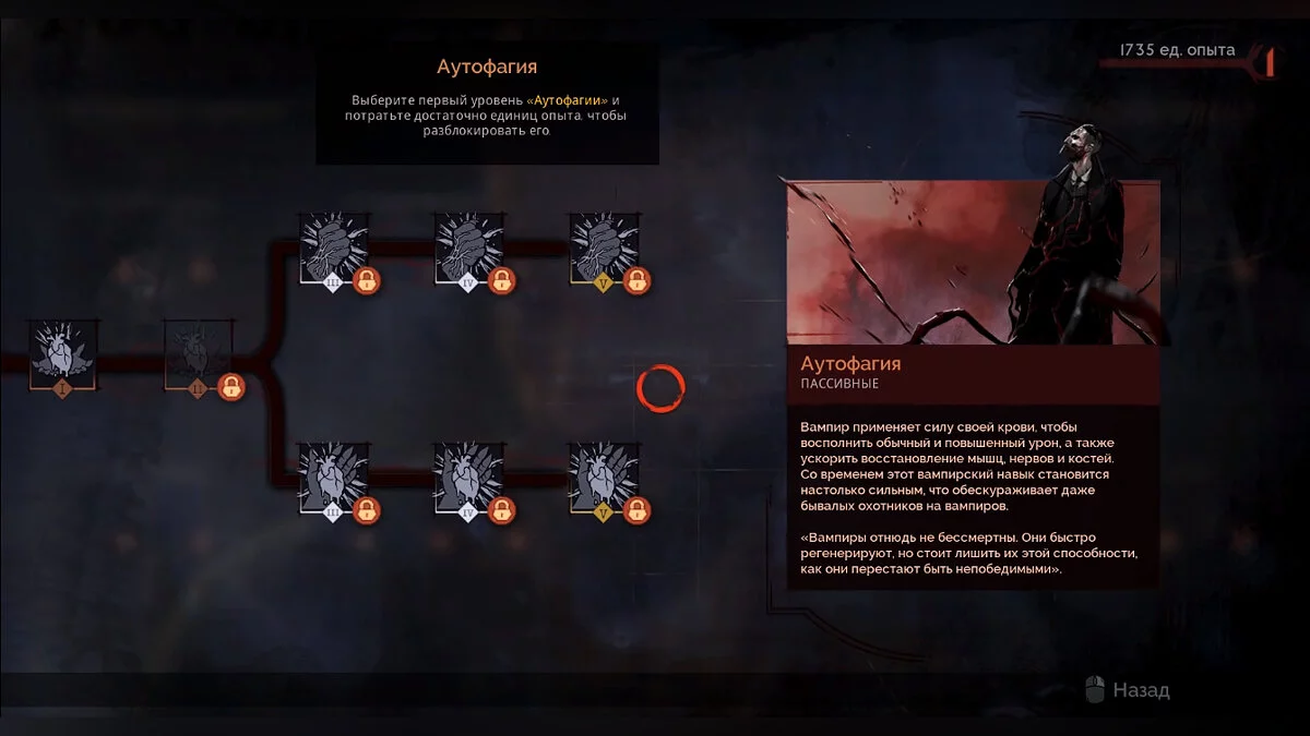 Игра сама предложит прокачать навык Аутофагия. При его использовании герой восстанавливает здоровье, расходуя свою кровь. У навыков есть улучшения.