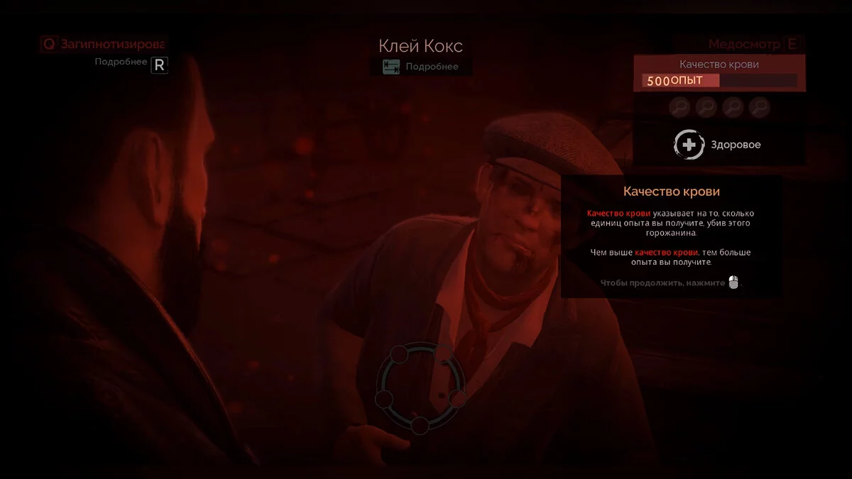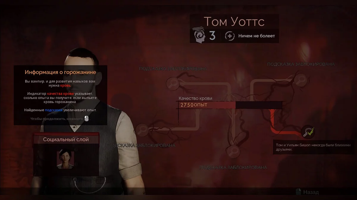 Говорим с человеком за столом. В прикроватной тумбе берем деньги. Спускаемся вниз и расспрашиваем про Помойного пса и Уилла Бишопа. Теперь можно посмотреть информацию о горожанах. Подсказки увеличивают количество опыта, получаемом при укусе.