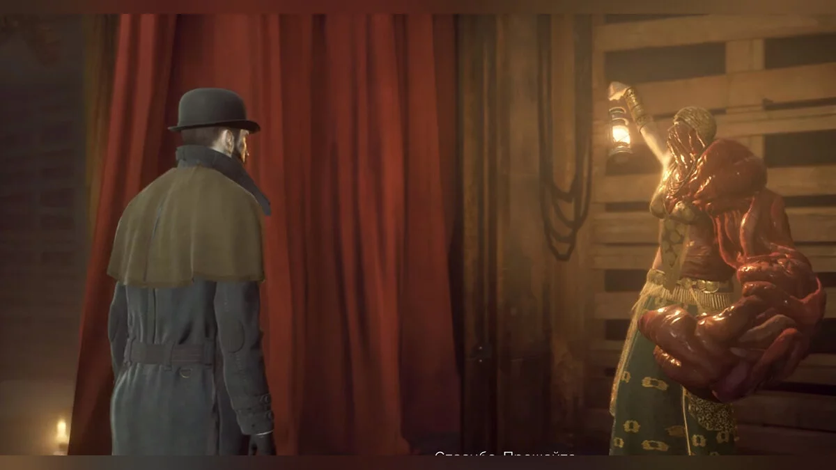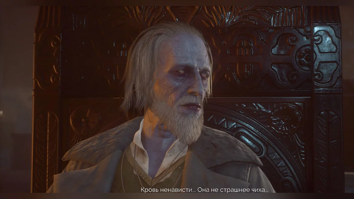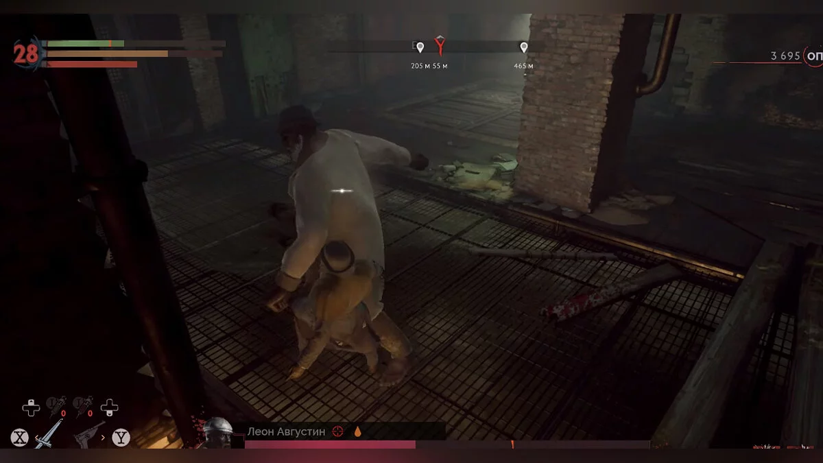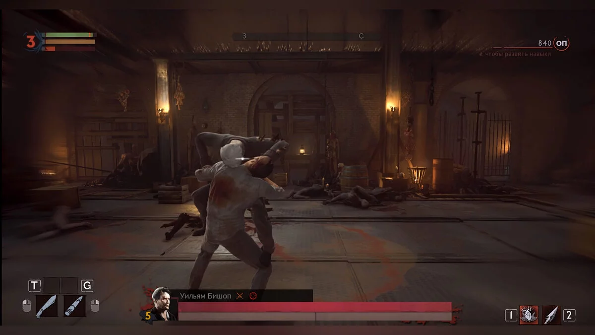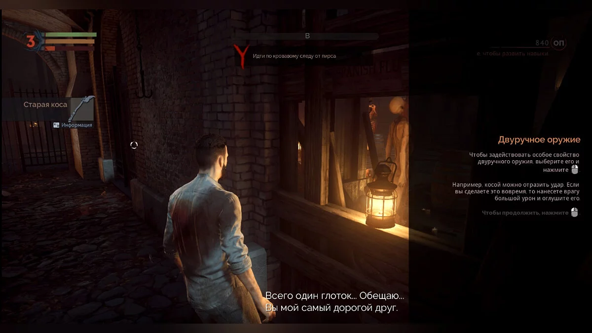 Открываем решетку и заходим в зал с трупами. Вот и Уильям Бишоп. Это первый босс в игре. Сражаться с ним придется в ближнем бою, так как у него высокое сопротивление к огнестрельному оружию. Наносим несколько ударов и отходим, повторяем. По возможности используем умения (они наносят много урона) и пьем его кровь. В награду получаем оружие — Старая палица. Осматриваем ящики и подходим к жертве. Смотрим кат-сцену.