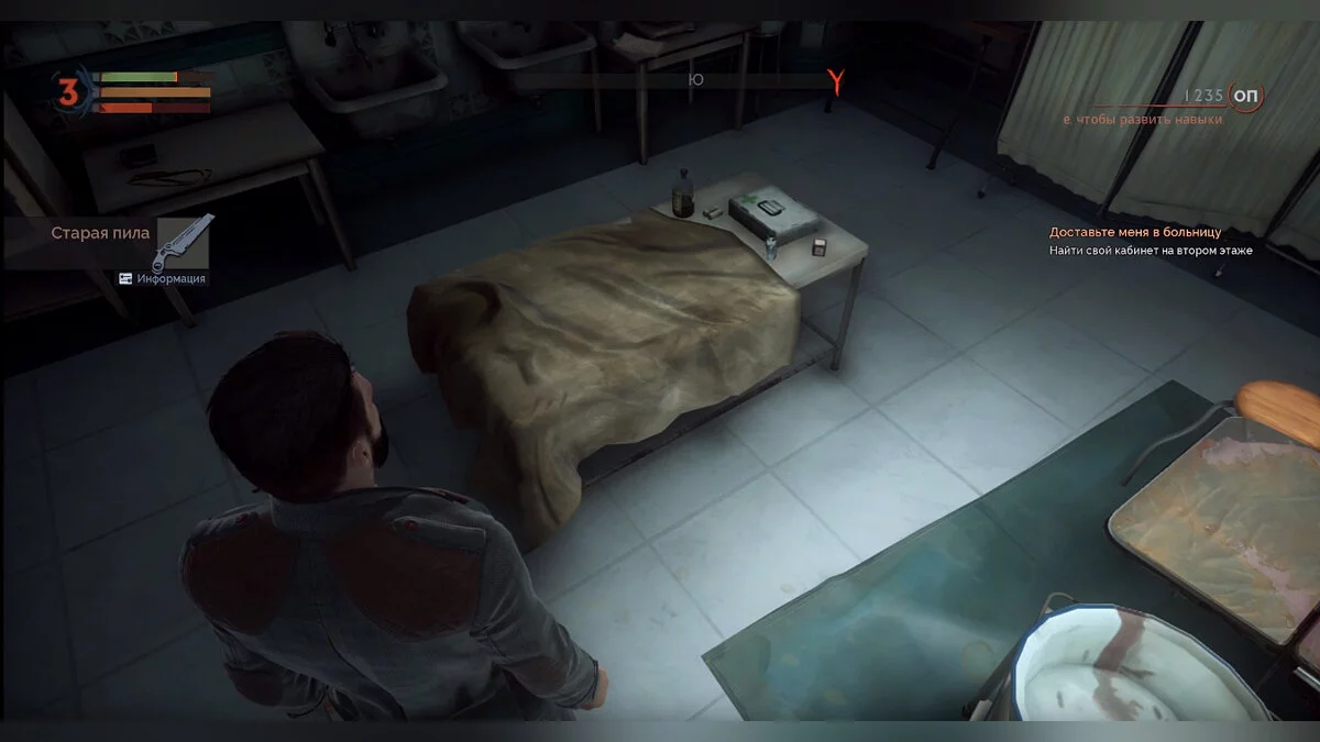 Идем назад, поднимаемся по лестнице и подходим к больнице. Говорим медсестре про Клея Кокса. Можно пообщаться с другими горожанами. У Милтона можно купить оружие (Дробовик Милтона) и детали для улучшения. В больнице много людей, с которыми можно поговорить. Поднимаемся по лестнице на второй этаж и находим свой кабинет. Перед этим подбираем оружие Старая пила в кабинете слева.
