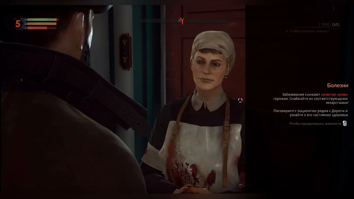 Возвращаемся в больницу и в своем кабинете делаем средство от переутомления. Несем его в палату к Дороти Крэйн. Если горожанин болен, то качество его крови снижается. Поэтому периодически нам придется лечить людей. Спрашиваем у больных какие лекарства им нужны.