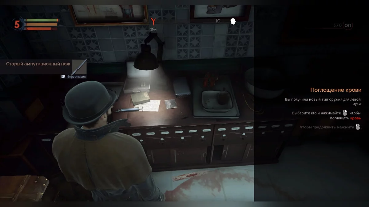 Проходим прямо по указателю. Обходим по кабинетам справа. Находим тело и рядом берем отчет о смерти. Это нужно для расследования. На столе рядом берем Старый ампутационный нож.