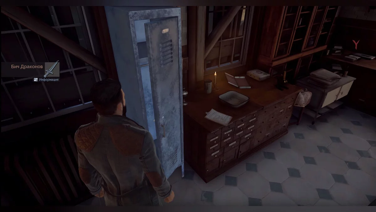 Идем дальше и находим Ричарда Нитеркотта. Он находится на кладбище. Говорим с ним про медсестру и отправляемся назад, в дом, который нас не пустили. Говорим с Дариусом и заходим внутрь. В комнате справа берем коллекционный предмет Древние врыколаки.