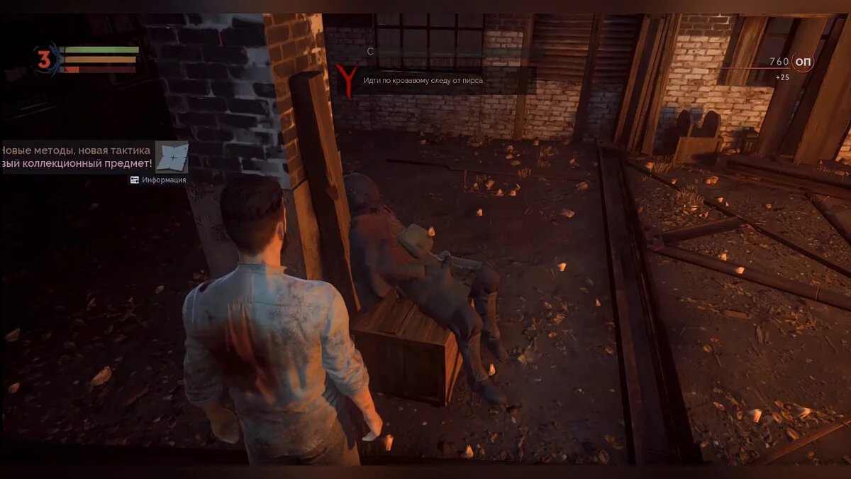 В помещении можно найти ящик с ресурсами. А если подняться на второй этаж, то еще одну коробку, но сперва придется разобраться с противником. Выходим в переулок и запрыгиваем на второй этаж противоположного здания. С другой стороны можно найти в чемодане оружие (Старая лупара). Спрыгиваем вниз и разбираемся с противниками у костра. Осматриваем ящики и подбираем коллекционный предмет — «Новые методы, новая тактика».