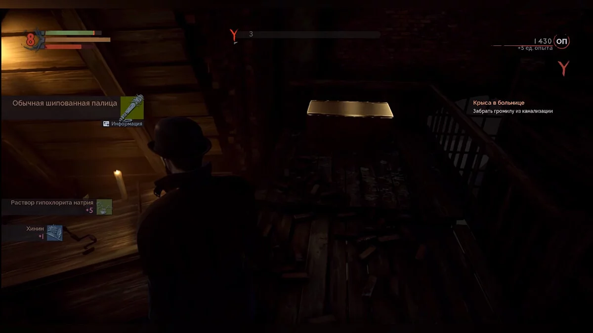 Заходим в здание. Через комнату справа можно выйти на улицу. Сперва поднимаемся на второй этаж. Разбираемся с противником и на столе берем хинин. В кабинете слева на столе берем ключ от подвала морга. В кабинете справа берем тартрат железа. На третьем этаже можно найти образцы крови. Спускаемся в подвал.