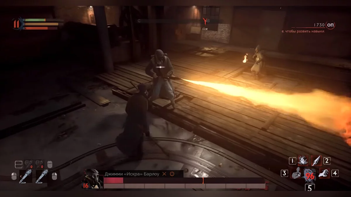 Идем вправо и в баре говорим с барменом Томом. У него можно получить дополнительное задание «Нехватка важного товара». Отправляемся по указателю в западные доки. В здании придется разобраться с охотниками на вампиров. У босса Джимми «Искра» Барлоу будет огнемет. От его выстрелов уходим в бок и атакуем. Периодически будут появляться его помощники. Стараемся крутиться вокруг всей группы врагов и атаковать главного. За победу получаем пистолет «Обычный парабеллум».