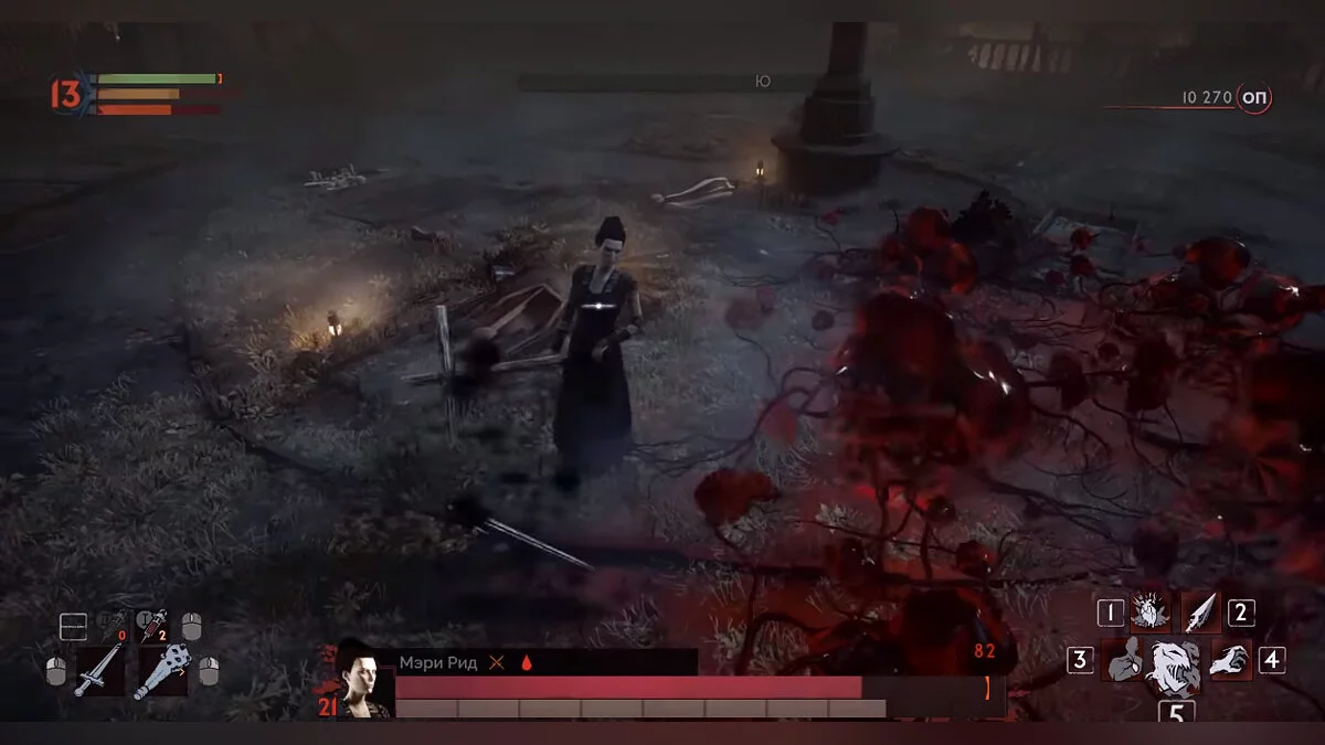 Впереди нас ждет довольно сложный босс — Мэри Рид. Она атакует крестом. После такой атаки делаем рывок назад и контратаку. Когда из нее будет литься кровь нужно не избегать следов на земле. Периодически она может использовать особую атаку, которая может сразу убить героя. От ее крика отходим подальше. Когда она потеряет треть здоровья она убьет священника, если вы не опередите ее. Пить с нее кровь крайне сложно. После победы хороним ее и смотрим кат-сцену.