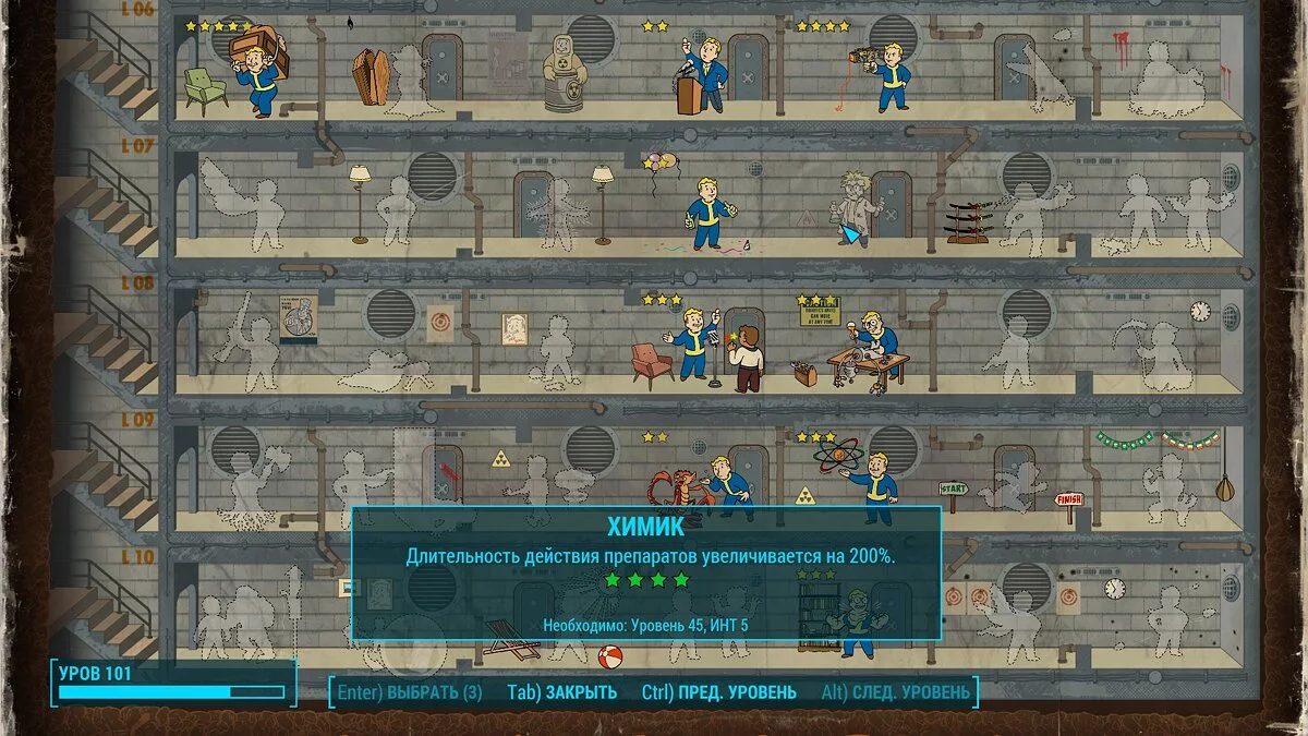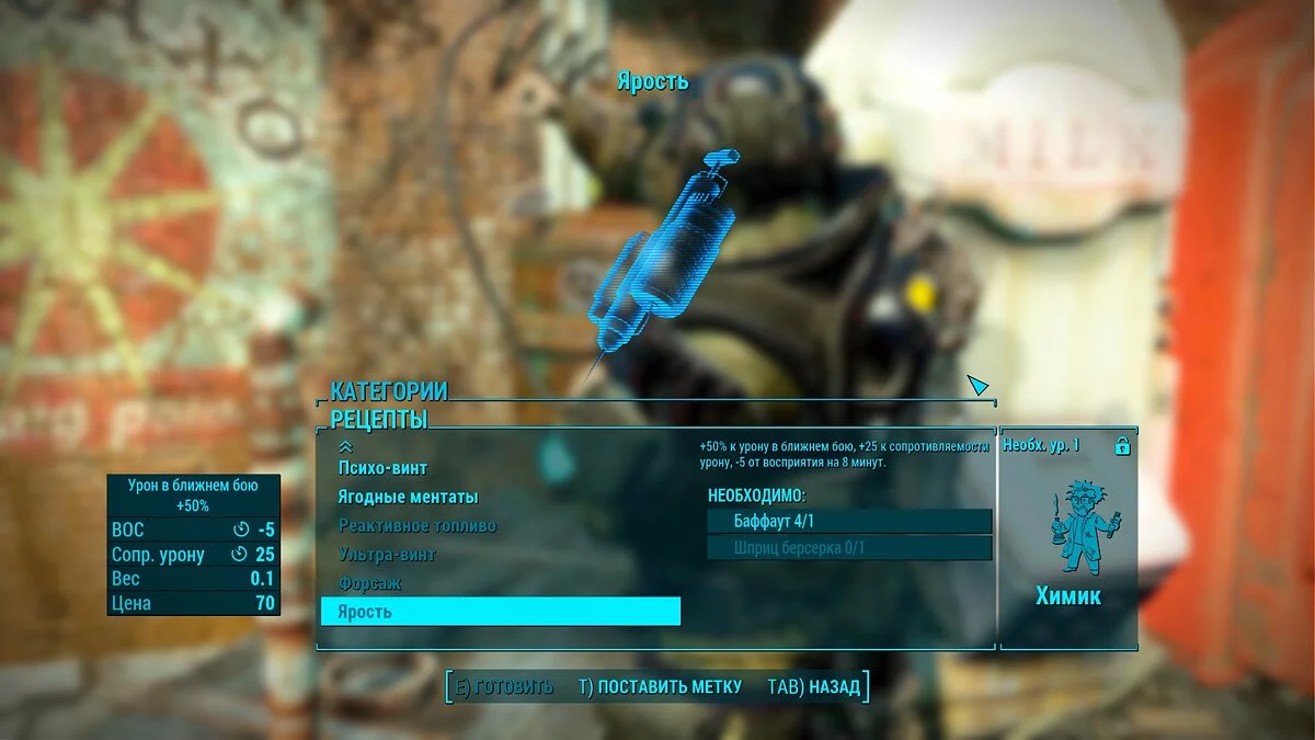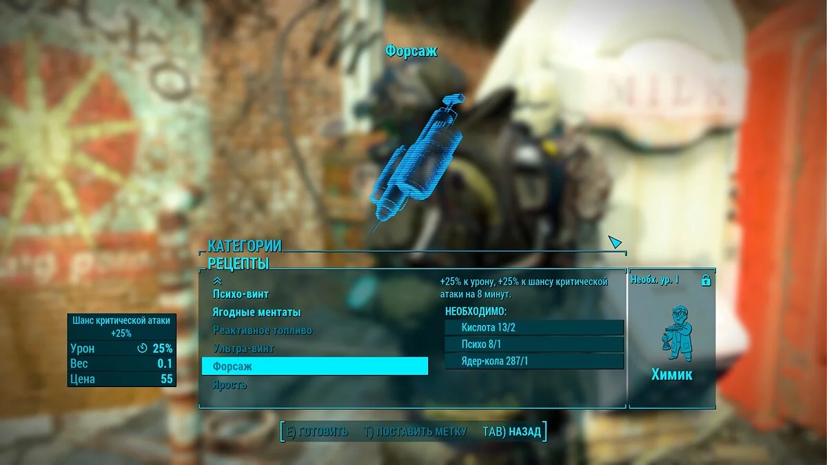 Чтобы самому создавать наркотические препараты в Fallout 4, в том числе редкие и крутые, потребуется перк «Химик», который открывается на 7 уровне ветки «Интеллект». Обязательно прокачайте его на 4 звезды, чтобы увеличить время действия всех принятых препаратов на 200%: