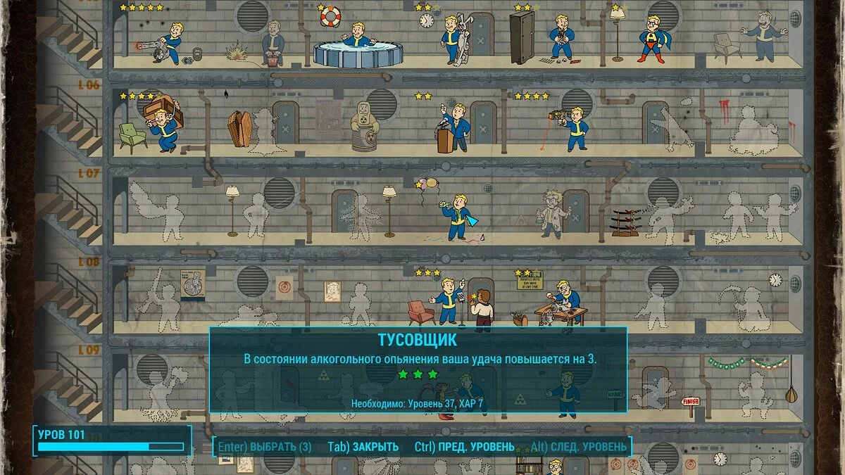 Не лишним будет напомнить, что в Fallout 4 много разного алкоголя, выпив который вместе с приемом химии, можно получить весьма забавные эффекты. Но потребуется полностью прокачать перк «Тусовщик», убирающий зависимость от алкоголя и повышающий удачу на 3 пункта: