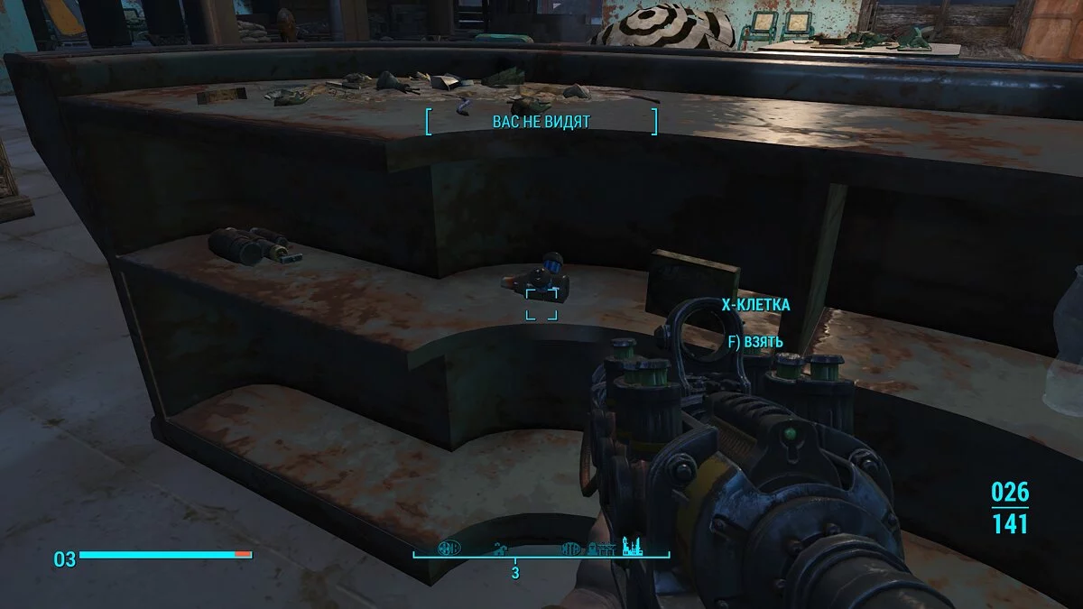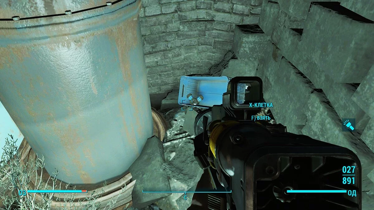 - В «канализации Фенс-Стрит», что недалеко от «Даймонд-Сити», спуститесь и в первом же зале, посередине, оглядитесь вокруг — вы найдете «Х-клетку» в синей пластиковой таре.