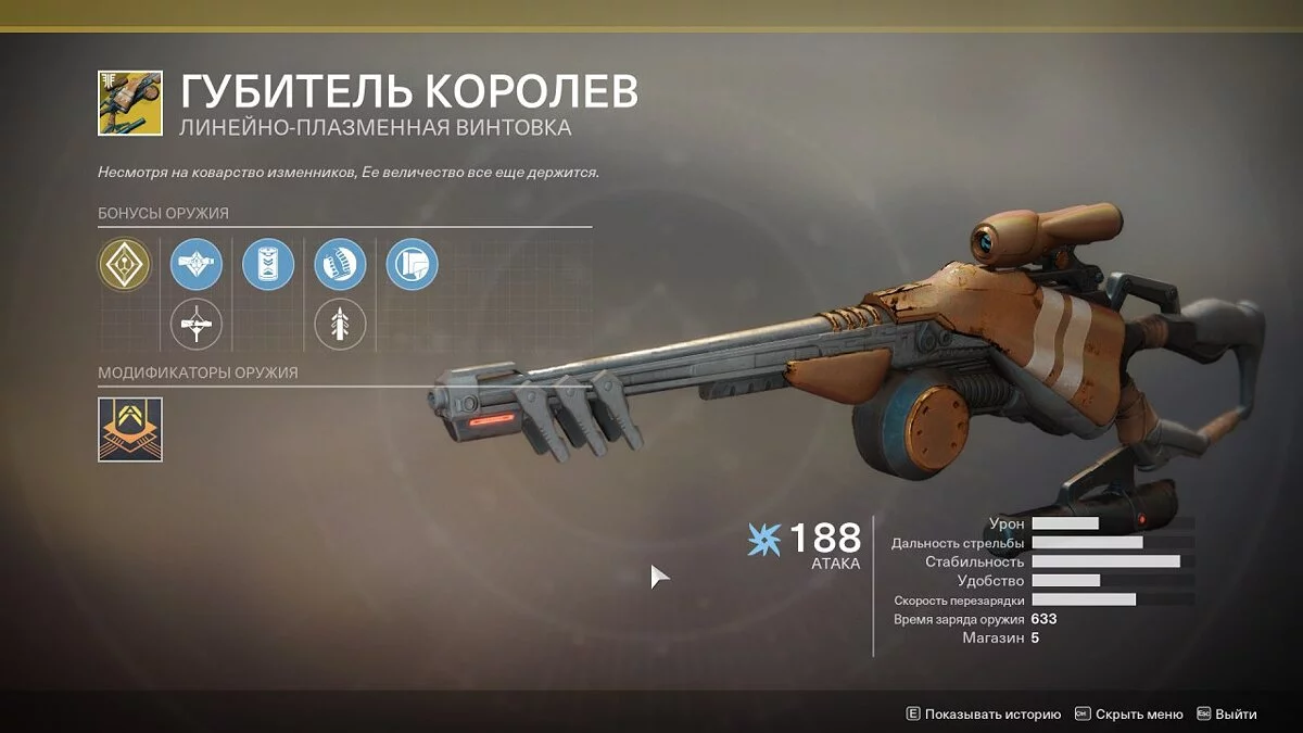 «Губитель королев» — это линейно-плазменная винтовка, позволяющая ослеплять врагов при попадании. Кроме того, есть две ее вариации. Первая стреляет дальше, но дольше перезаряжается, а вторая же наоборот. При этом, можно увеличить магазин оружия или же применить другие улучшения, которые позволят сделать винтовку еще более эффективной.