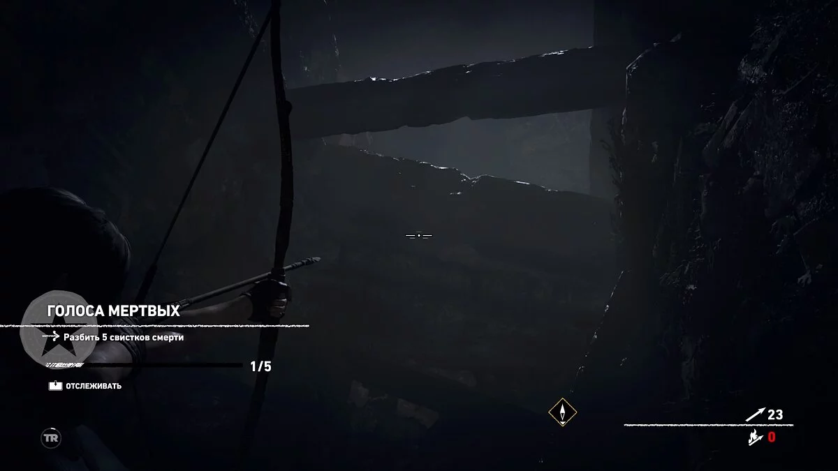 Осматриваем монолит в центре. Берем банку с ресурсами и изучаем фреску. При помощи лука расчищаем проход. Впереди будет ловушка. Пригибаемся, чтобы пройти под копьями. Под потолком будет висеть Свисток смерти, нужный для испытания Голоса мертвых (1 из 5).