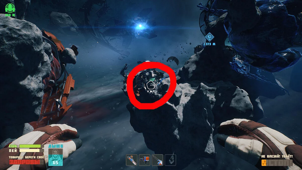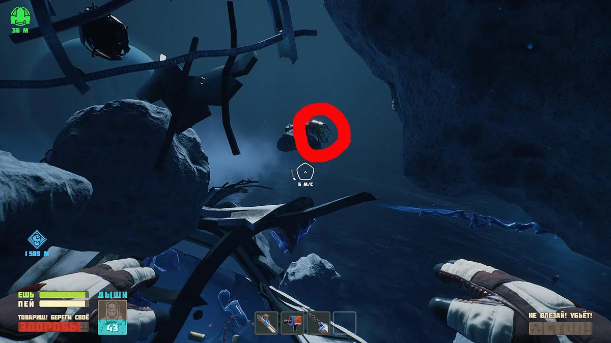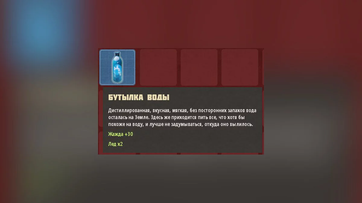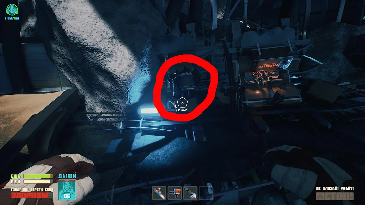 Для получения Воды необходим Лед. Лед можно найти снаружи у челнока главного героя. Он находится справа, где начинается синий путь. Находим синие канистры с водой. Можно использовать дрель, чтобы сразу получить Бутылки с водой.