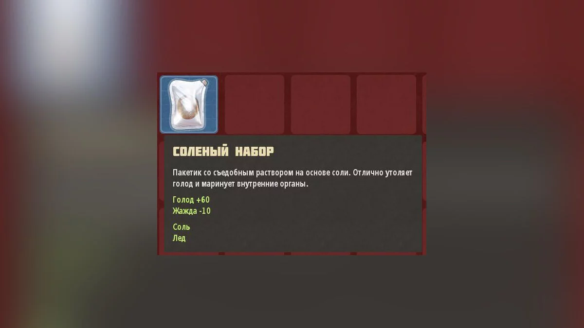 Для получения Соленого набора нужна соль. Готовые Соленые наборы и коробки соли можно найти на обломках другого челнока впереди от челнока главного героя.