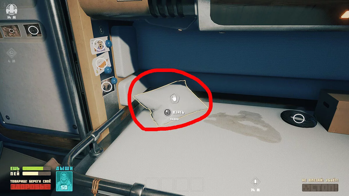 Ткань можно найти в главном челноке. Ее можно получить из обшивки и подушек. Но для этого нужен секатор.