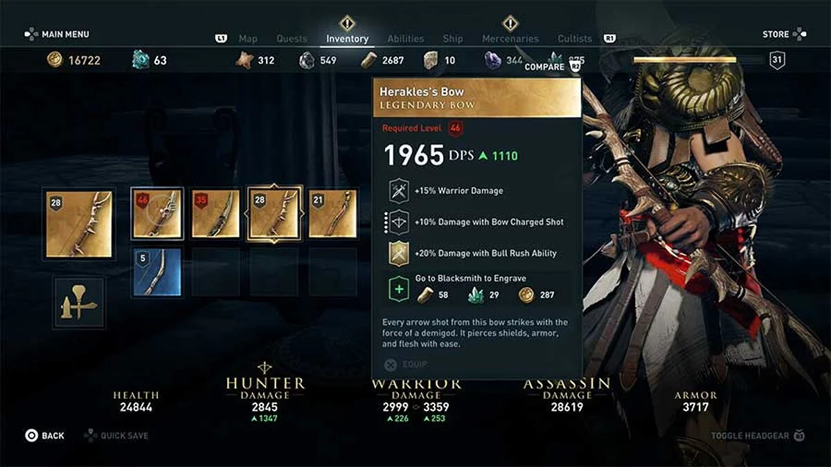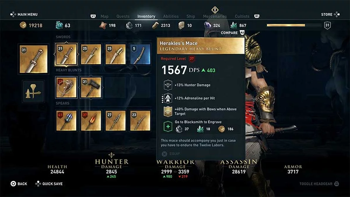 Булава Геракла (Herakles's Mace) — Легендарное оружие с полезной гравировкой: урон при стрельбе из лука увеличен на 40%, если игрок находится выше противника. Найти можно в сундке в Храме Деметрия и Коры (Temple of Demeter and Kore), в Аркадии (Arkadia).