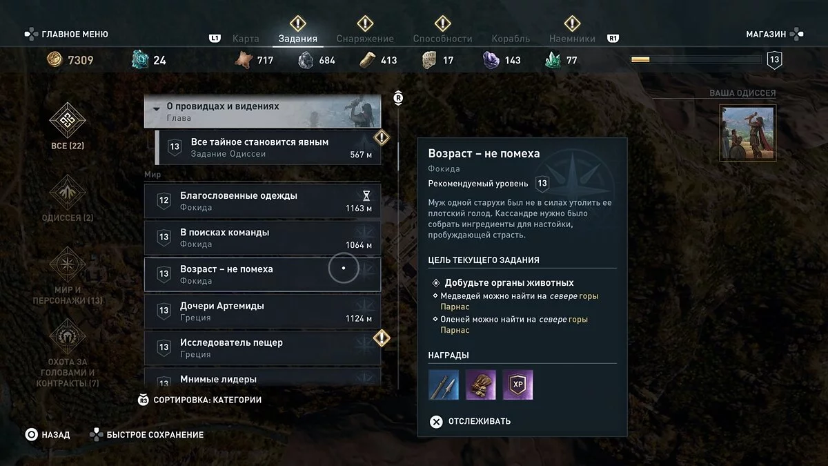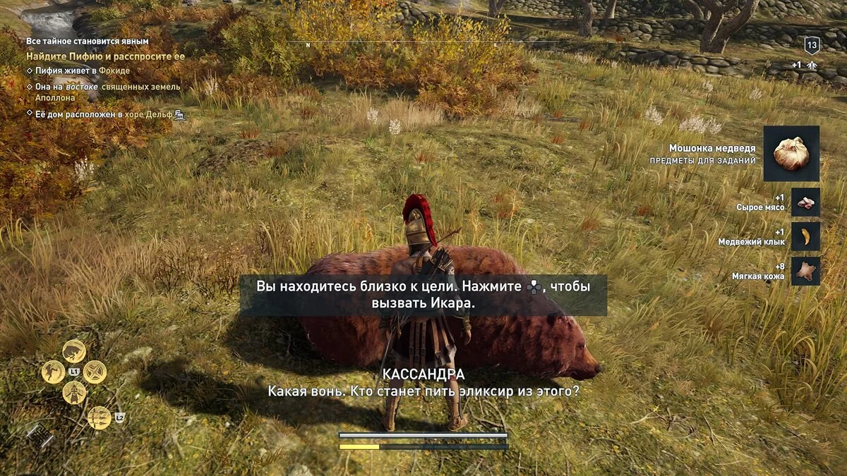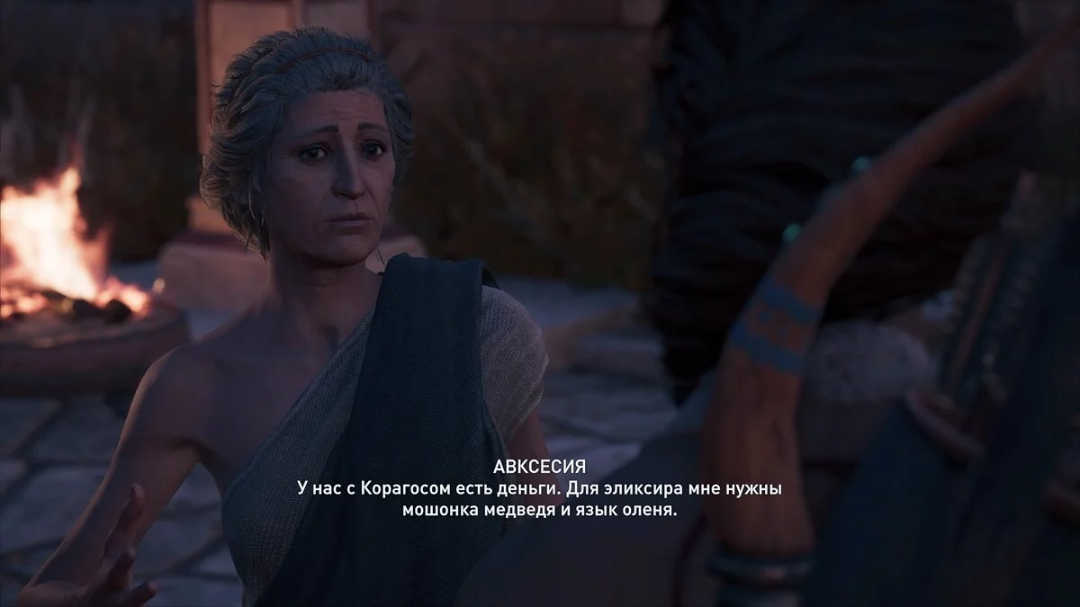 Находим ее около храма Аполлона. Идем в лес и выбиваем нужные ингредиенты из медведя и оленя. Относим их обратно в храм.