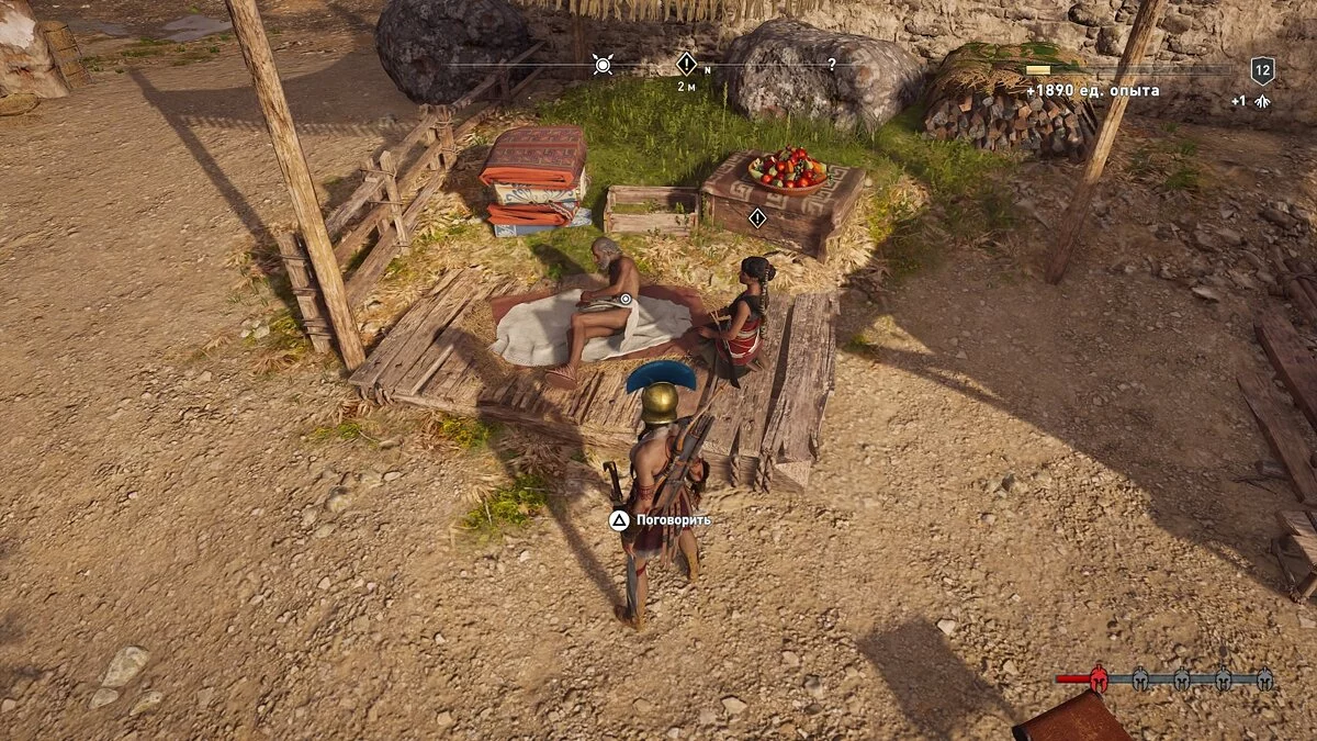 Позднее его можно встретить около Храма Афродиты. Он попросит доставить посылку в местный форт. Относим пакет, сообщаем от кого пришли и возвращаемся за «наградой».