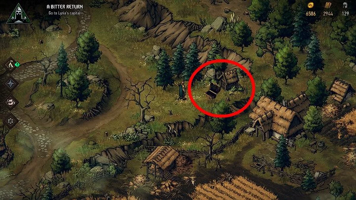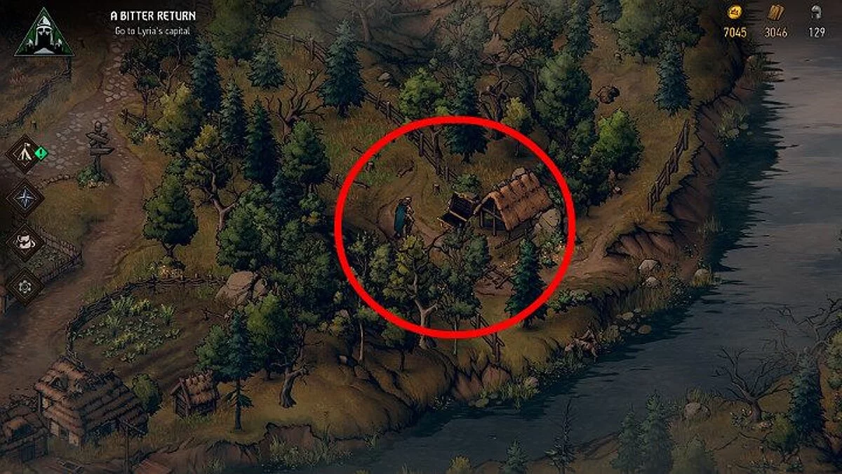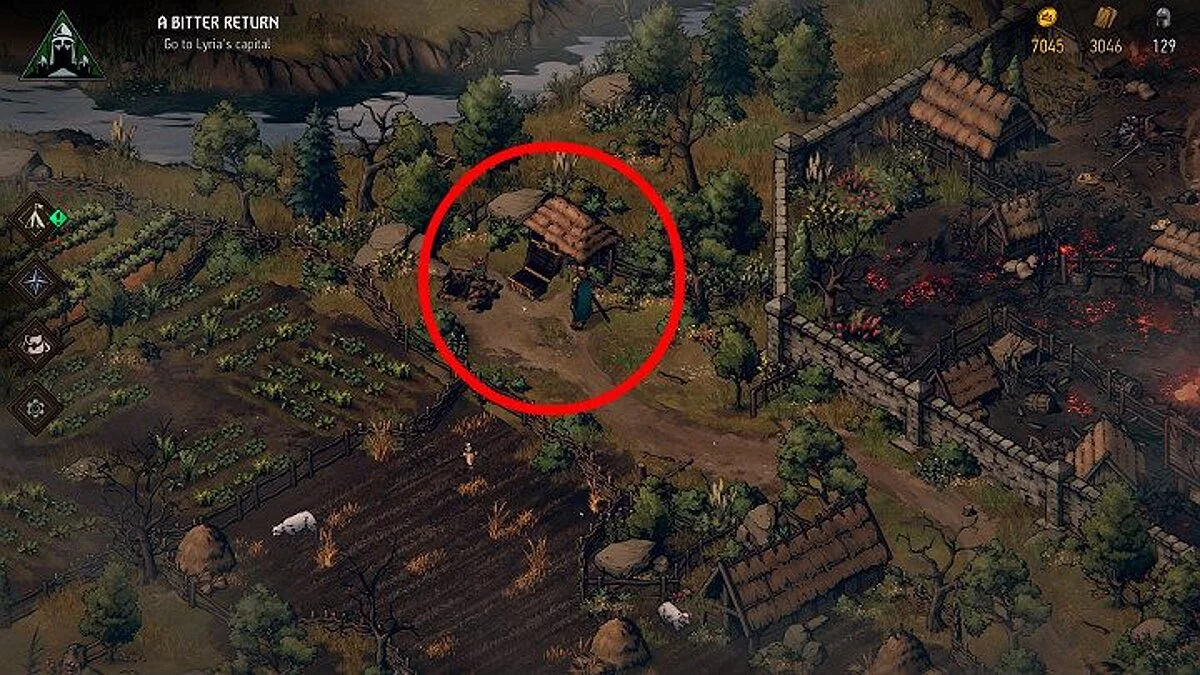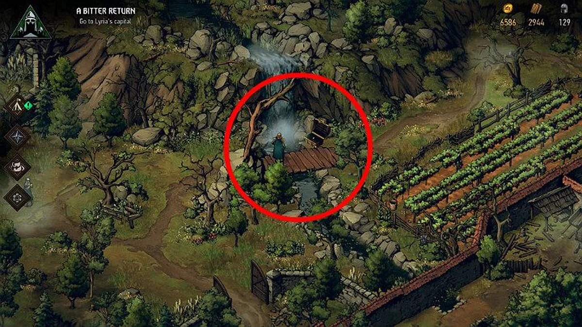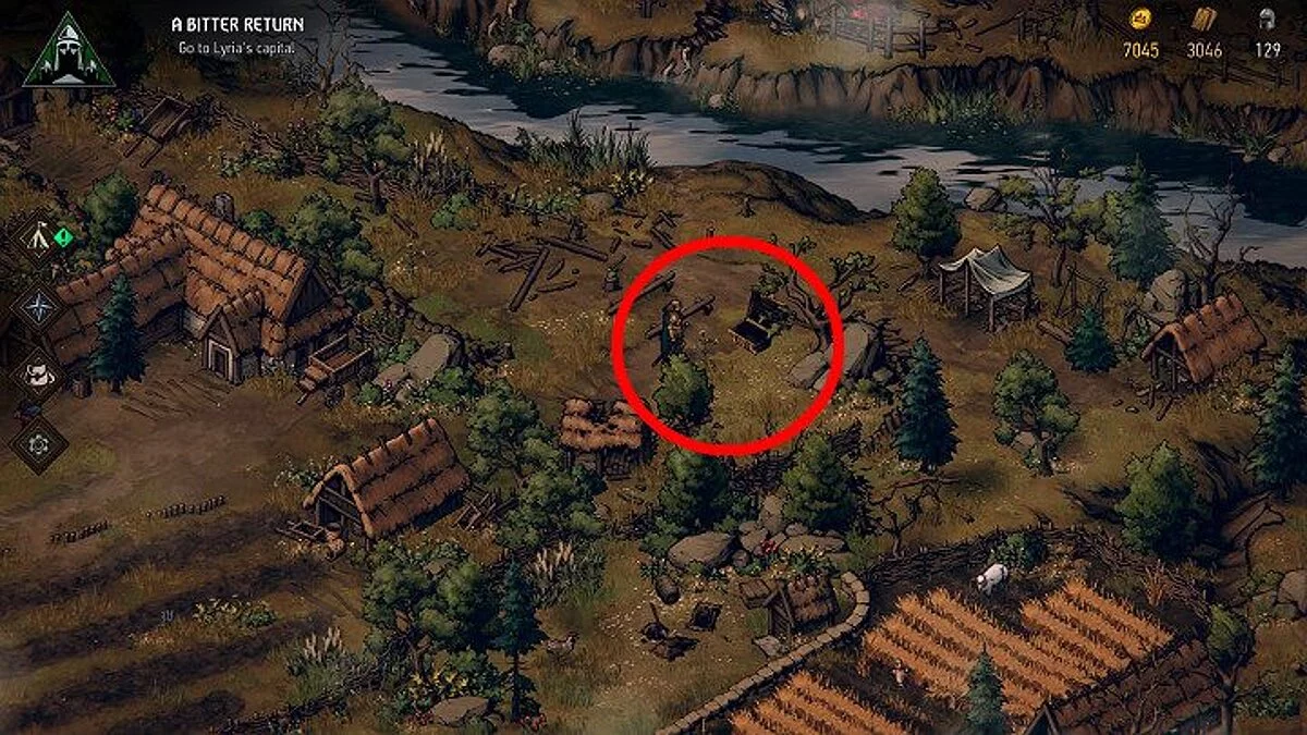 Десятое сокровище в Лирии находится рядом с упавшим деревом. Сундук находится рядом с фруктовым садом, но сперва вам придется решить конфликт между двумя семьями. Двигайтесь к реке — сокровище находится на месте, представленном на картинке выше.
