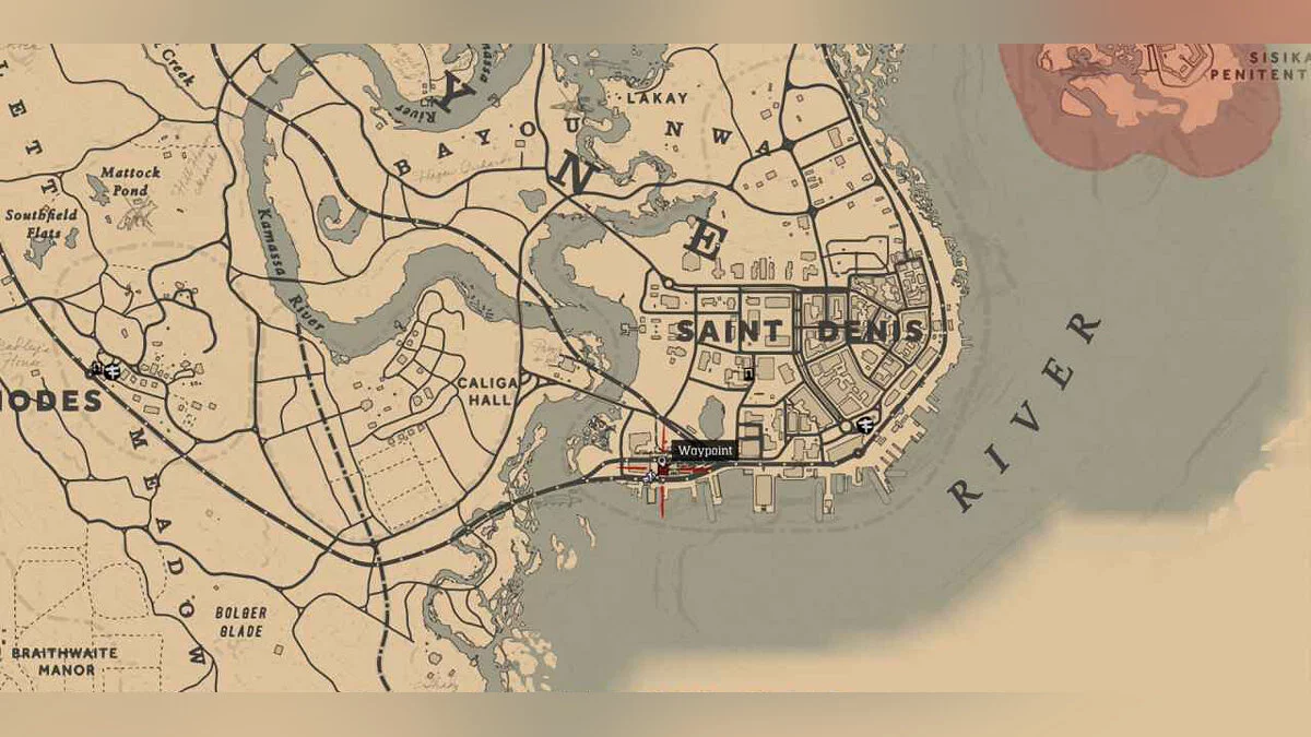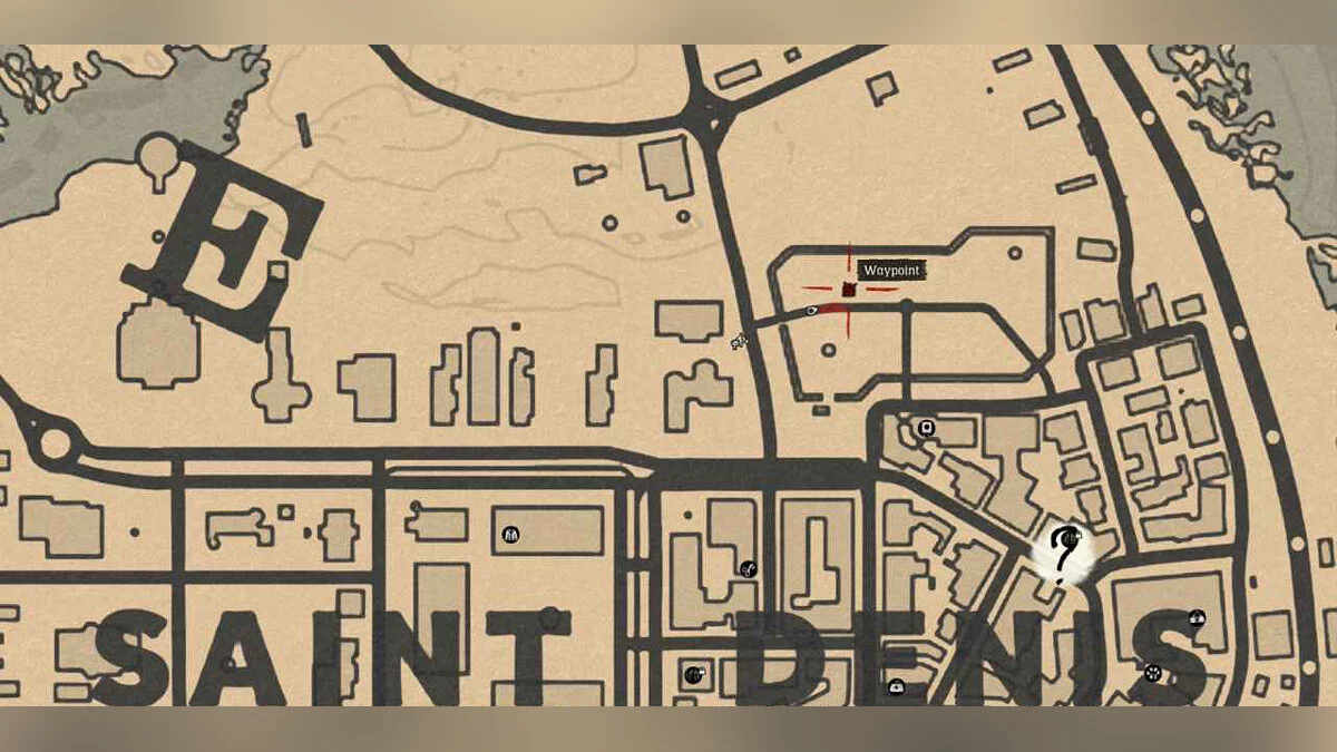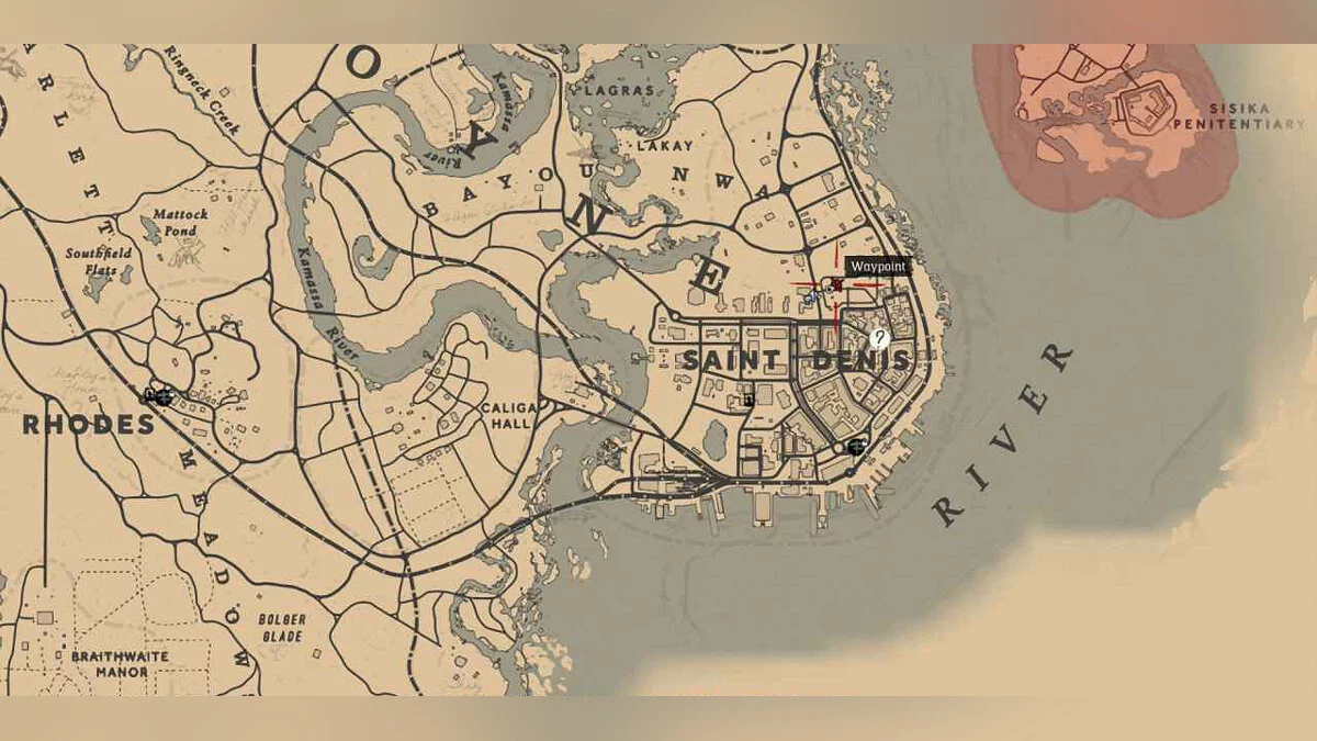 Сокровище мертвых Карта 2: В Сен-Дени (Saint Denis) есть подземный проход под одним из зданий (вход на скриншоте). В подземном проходе карта сокровищ находится в стене, рядом с деревянным ящиком.