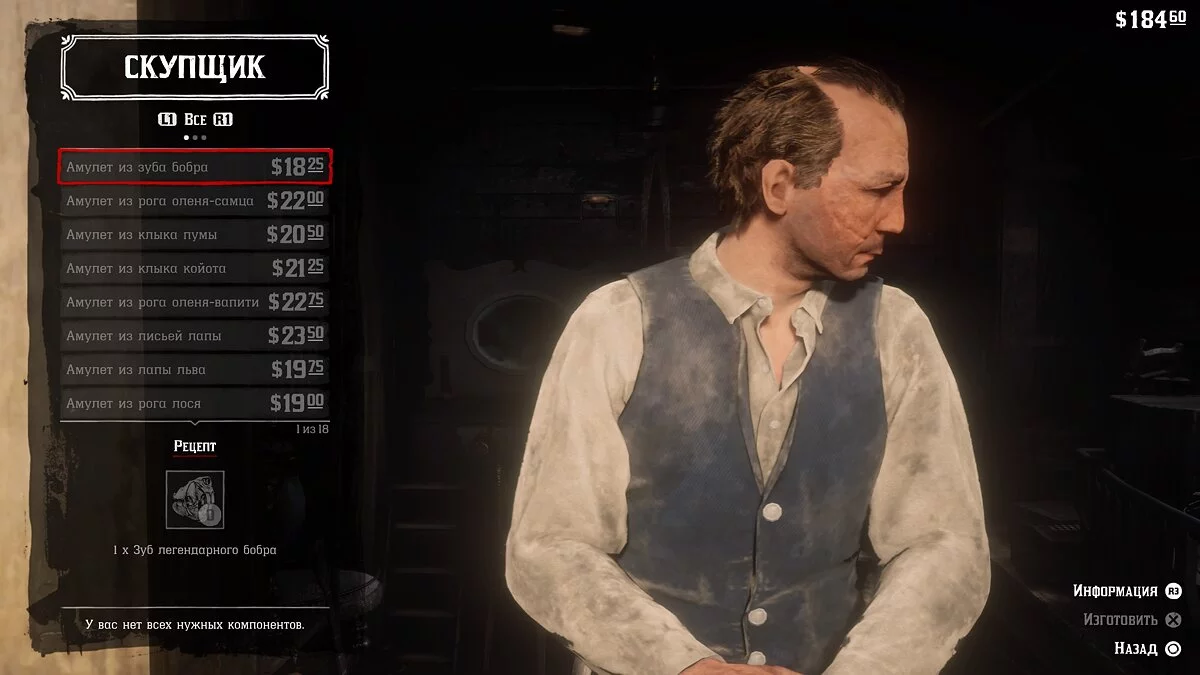 Ряд магазинов в мире RDR 2 предлагают ремесленные услуги для обновления вашего снаряжения — они создают амулеты и талисманы — но только если вы предоставите скупщику необходимые материалы. Для каждого амулета нужно убить того или иного животного и забрать нужный ингредиент.
