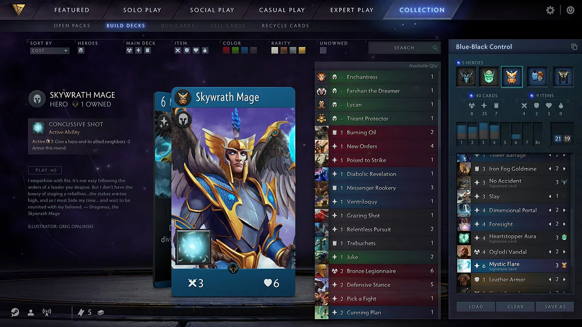 Ваша колода состоит из трех компонентов: основная колода, колода предметов и колода героев. У вас должно быть ровно пять героев — аналог пяти героев, которые составляют команду в Dota 2. В основной колоде должно быть как минимум 40 карт, 9 для колоды предметов, но нет предела для максимального количества карт в каждой категории.