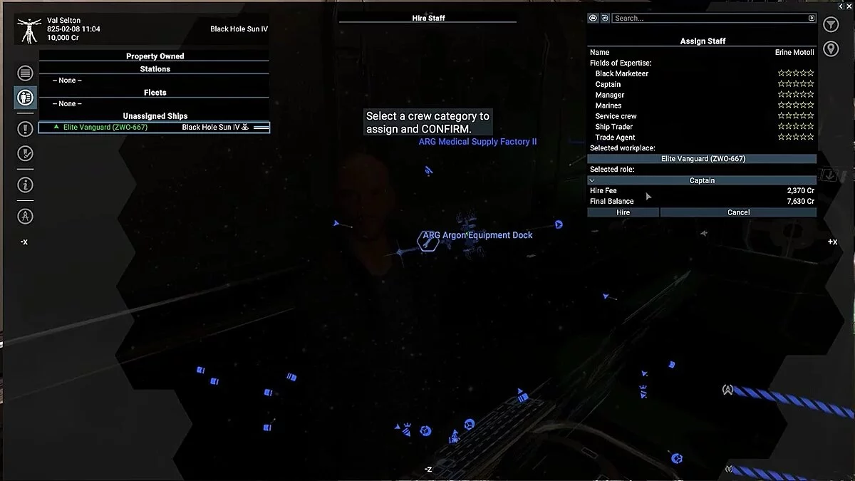На станции можно нанять капитана, пилота, десантника и другой персонал для кораблей, которые теперь не летают сами по себе, как это было раньше. В первую очередь нанимайте капитанов, поскольку они могут командовать вашими добывающими, торговыми и другими кораблями, пока вы будете заниматься другими делами.